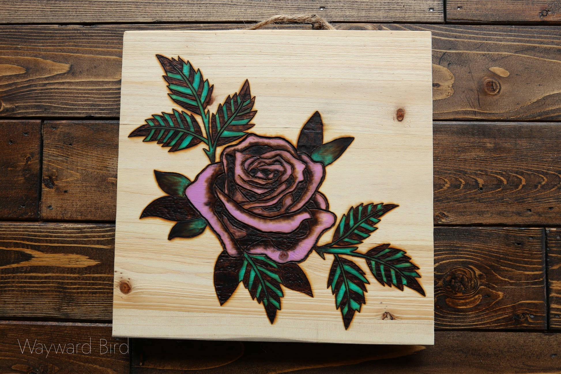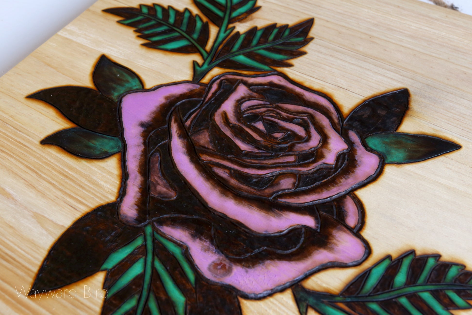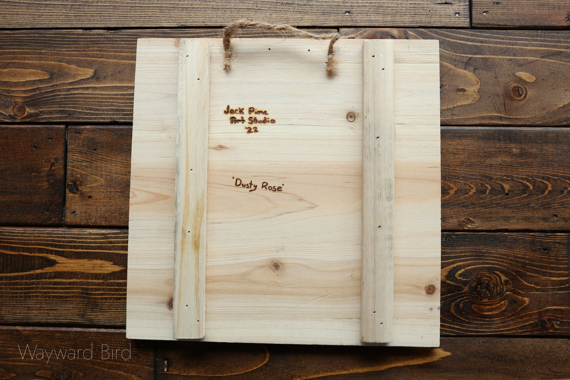Dusty Rose is an artwork hand-burned and painted on a wood panel by pyrography artist, Natasha Allen.