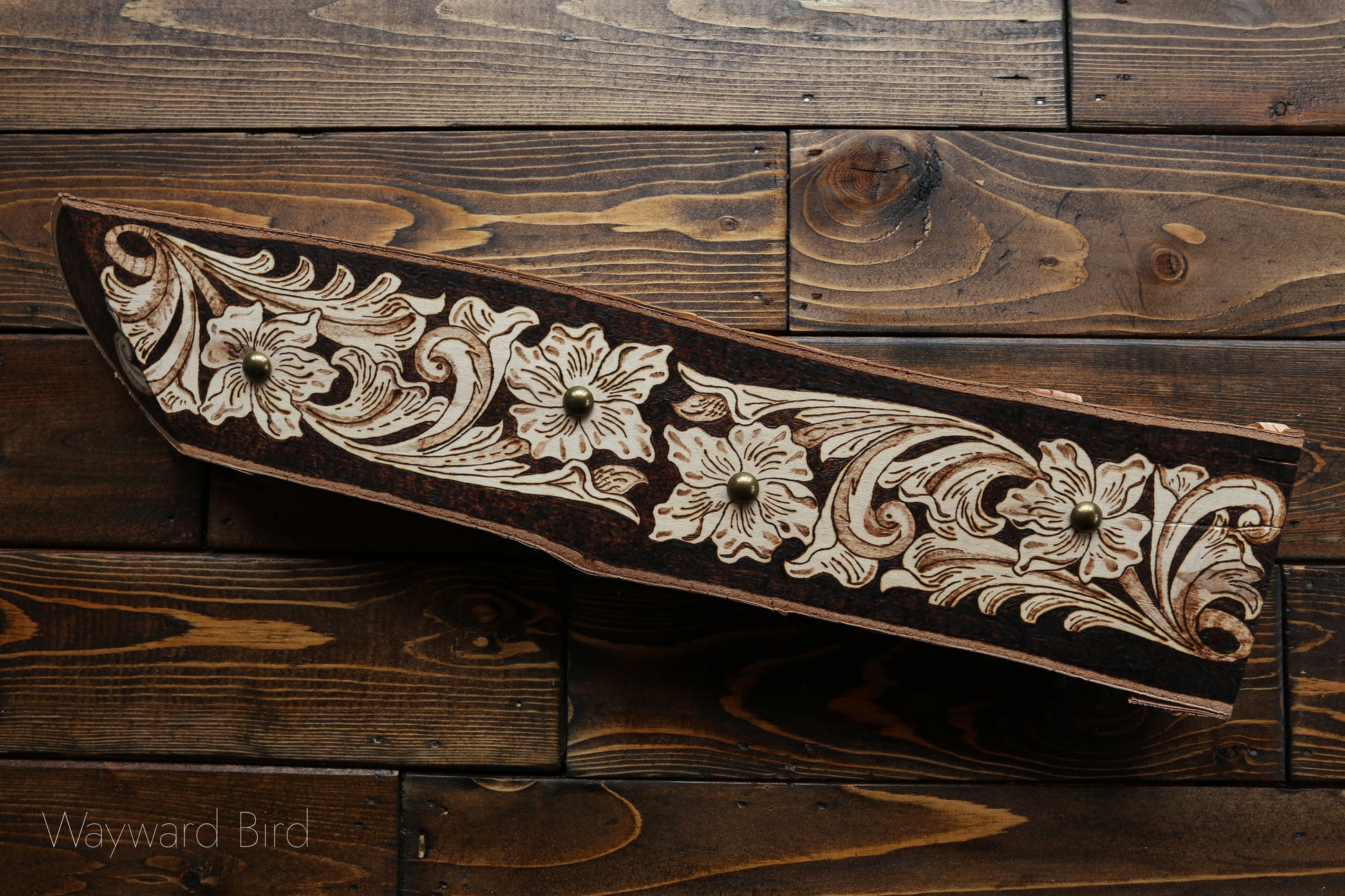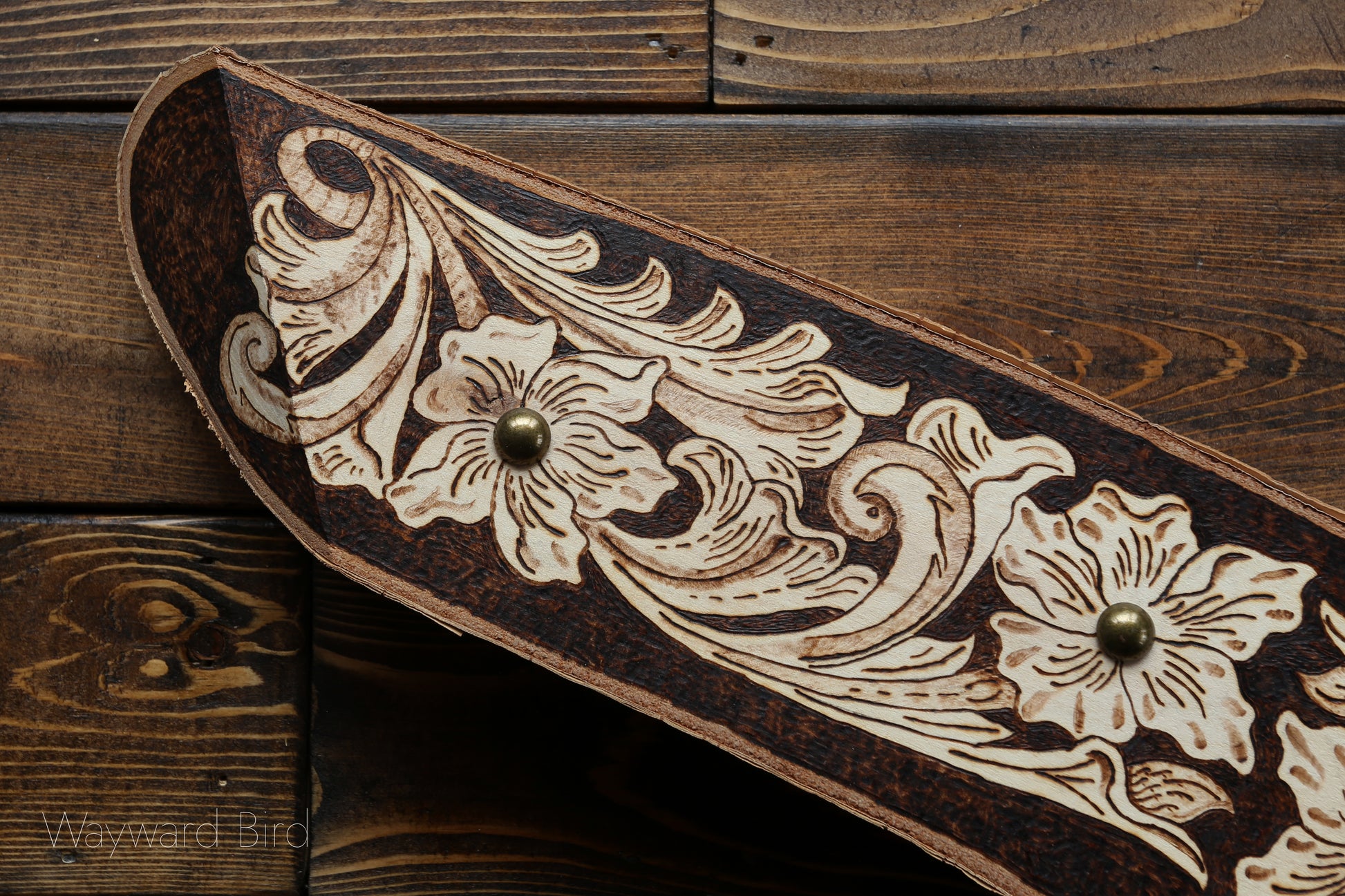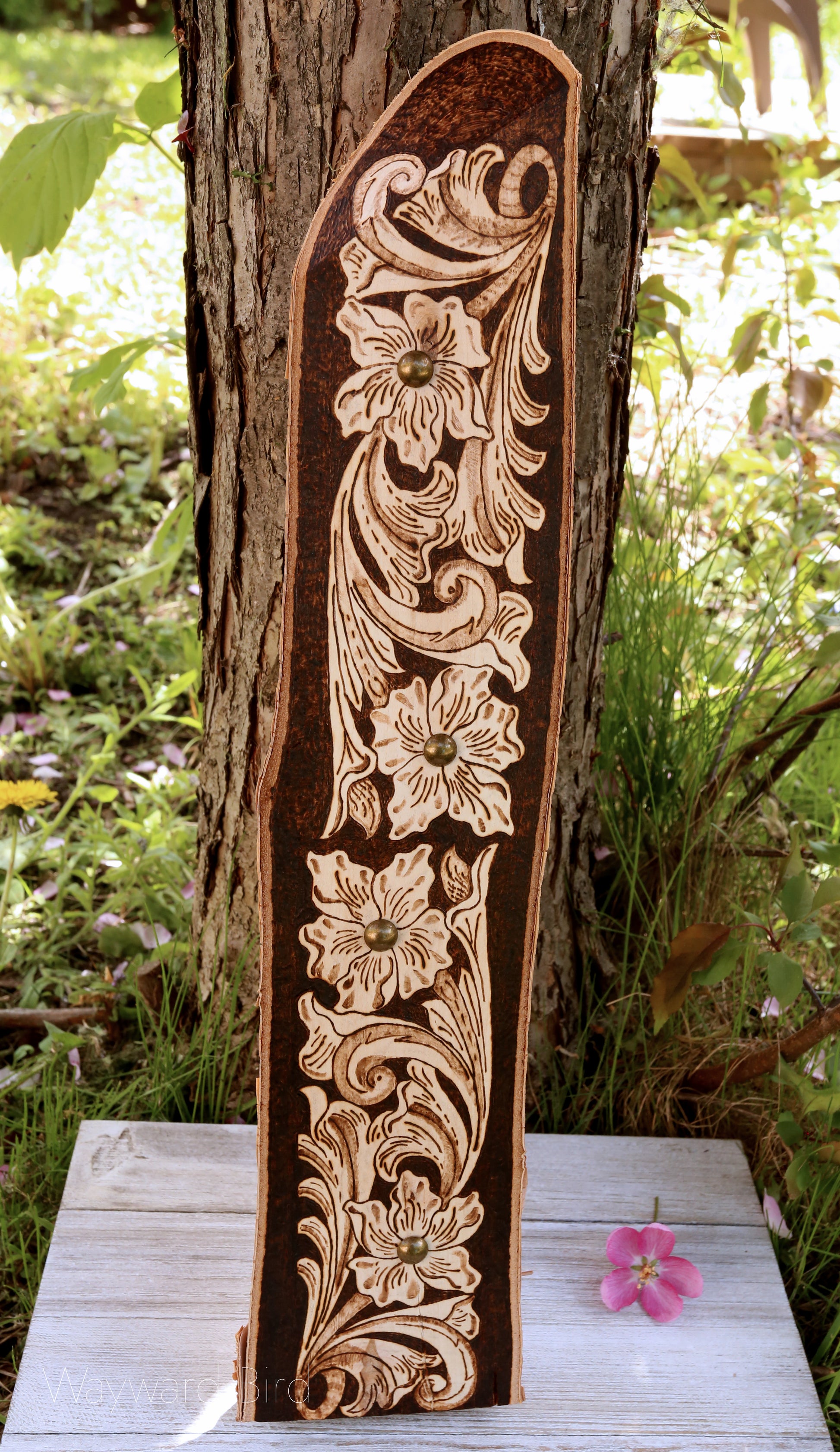 Floral Design is a hand-burned artwork by pyrography artist, Natasha Allen. A Tandy Leather floral Craftaid pattern was used for the design. There are 4 brass upholstery tacks affixed to the flower centers.