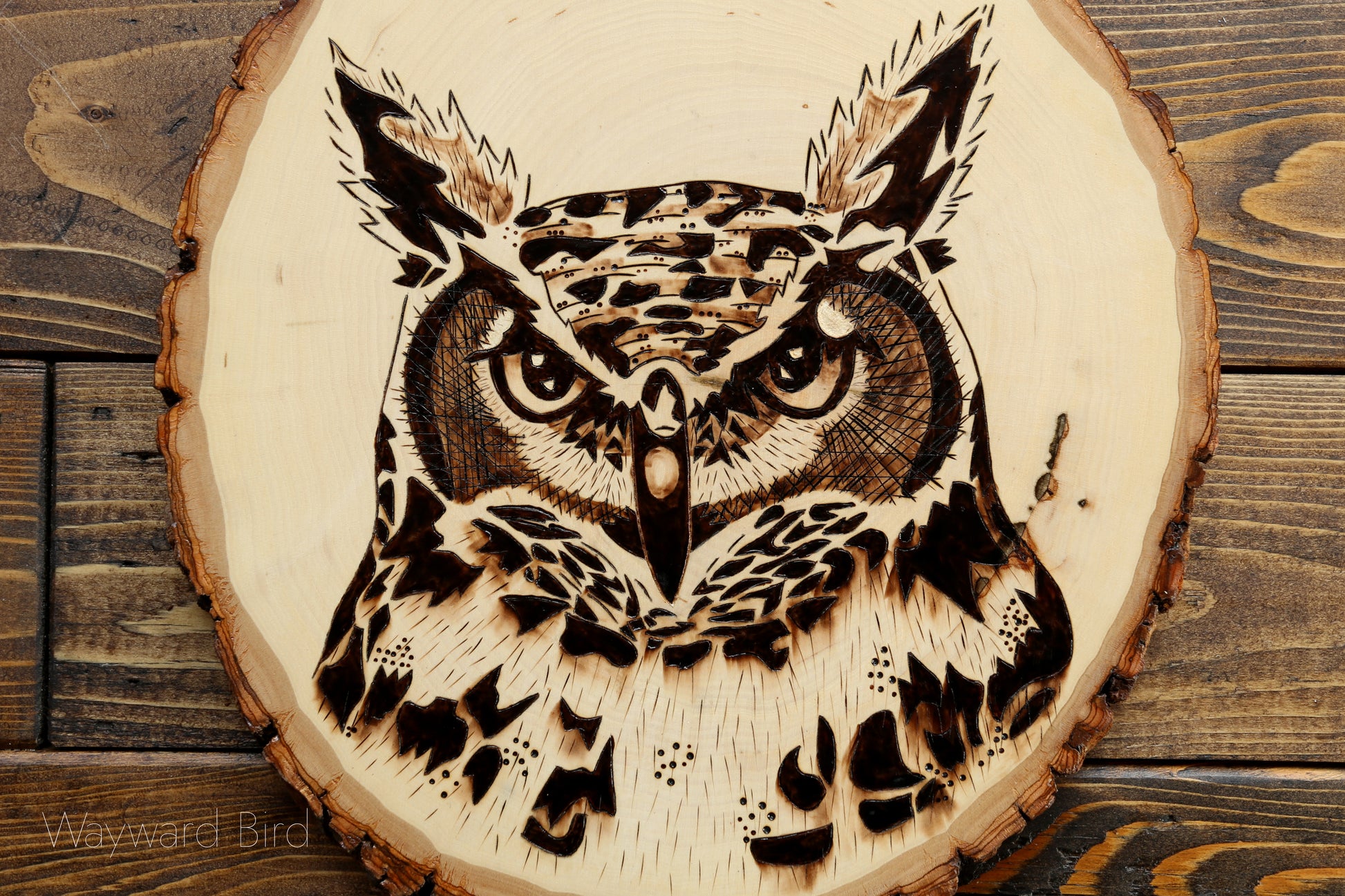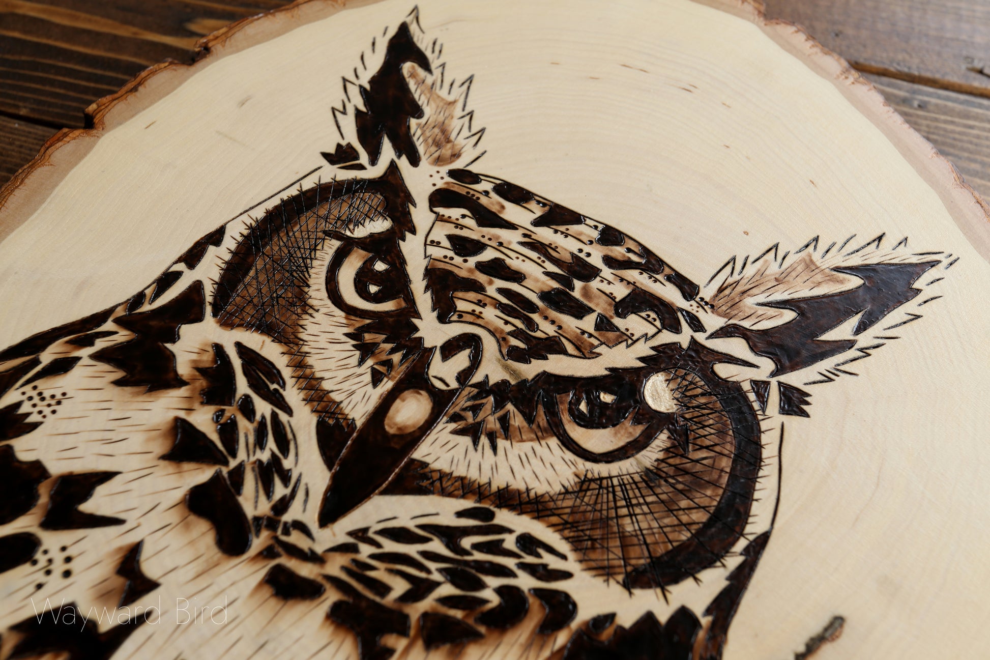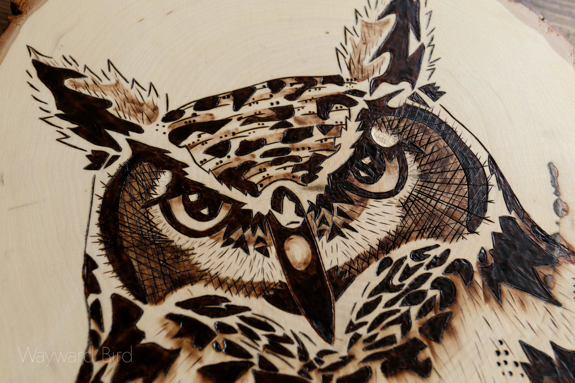 Great Horned Owl is an artwork hand-burned on Basswood by pyrography artist, Natasha Allen.