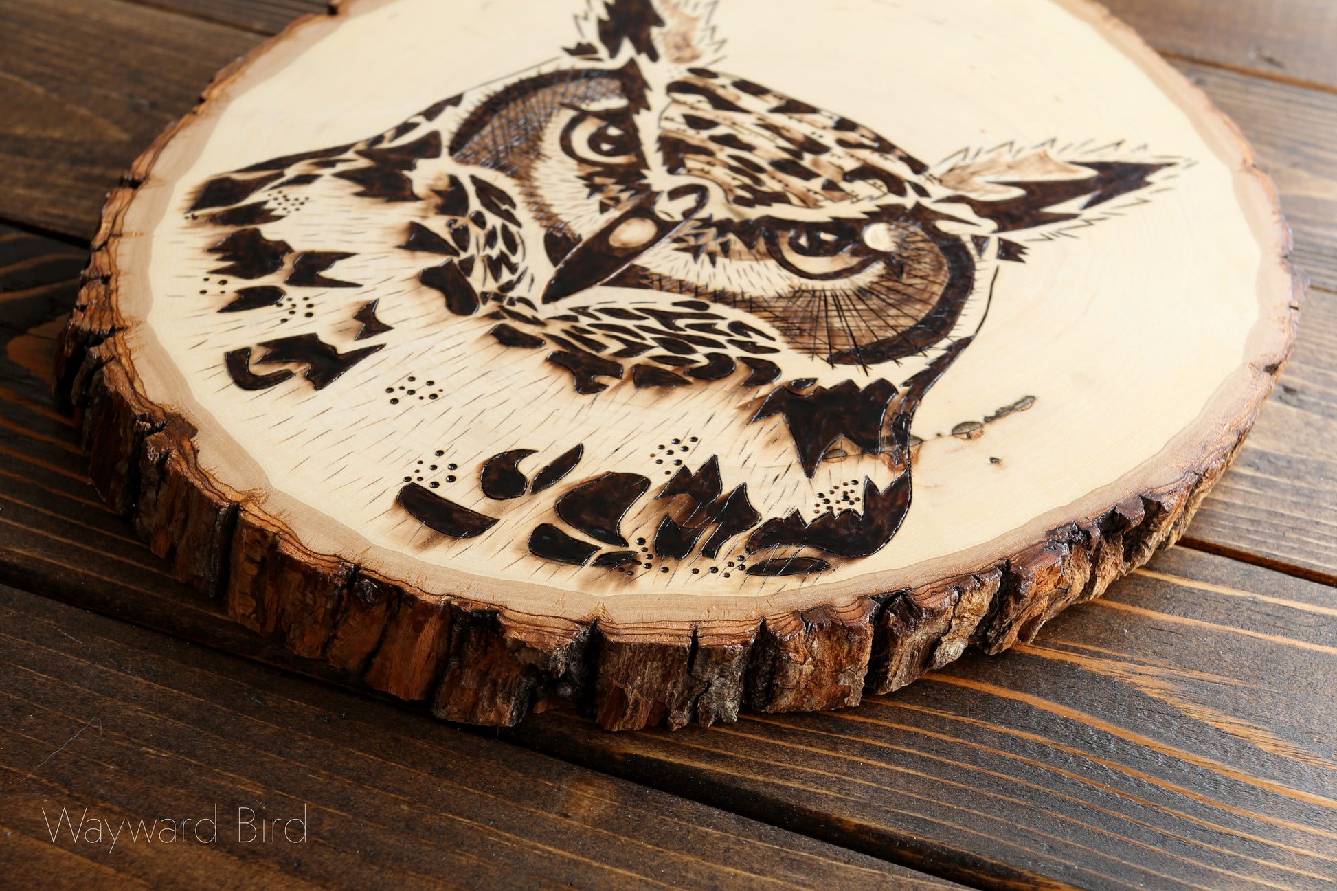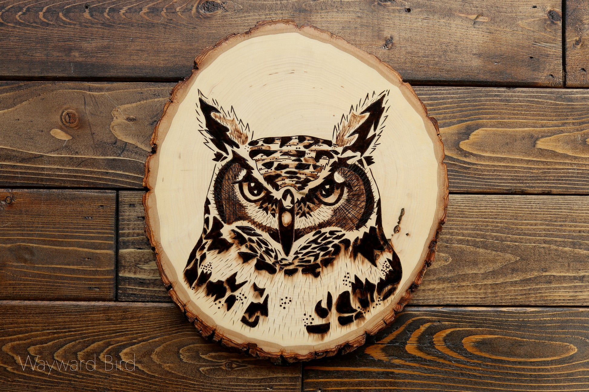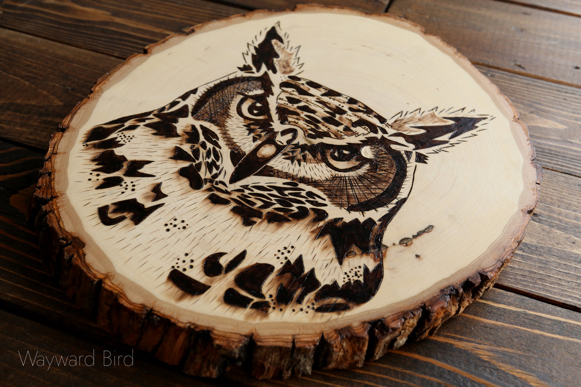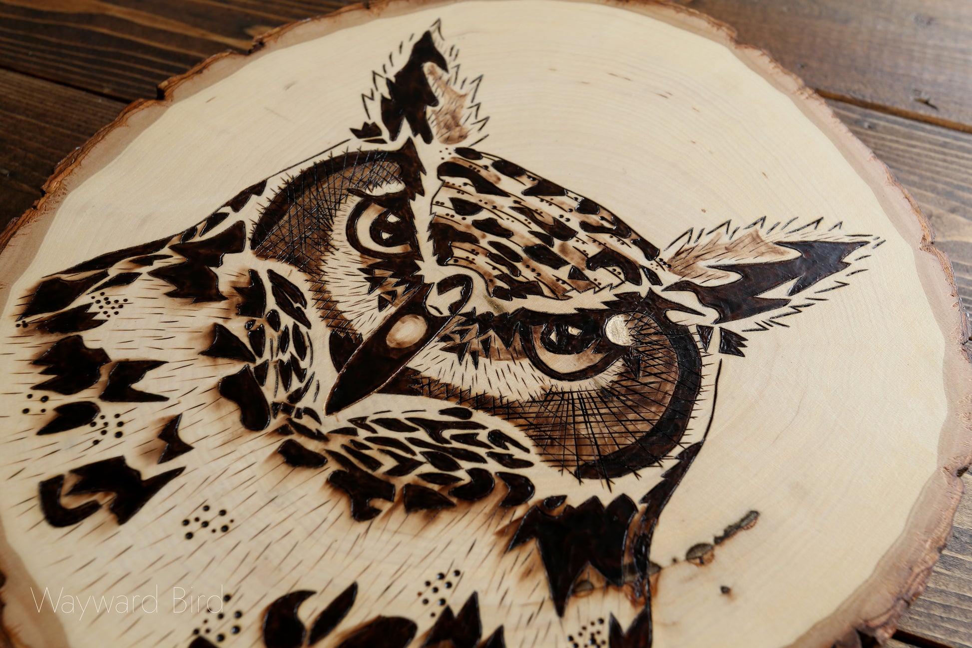 Great Horned Owl is an artwork hand-burned on Basswood by pyrography artist, Natasha Allen.
