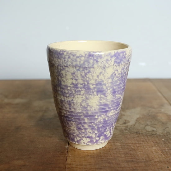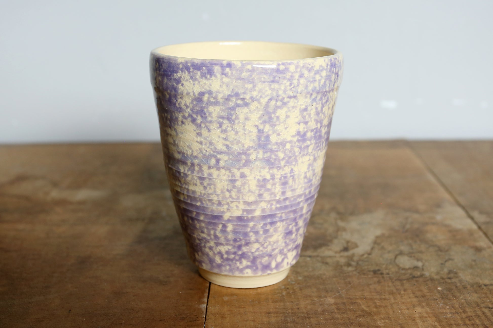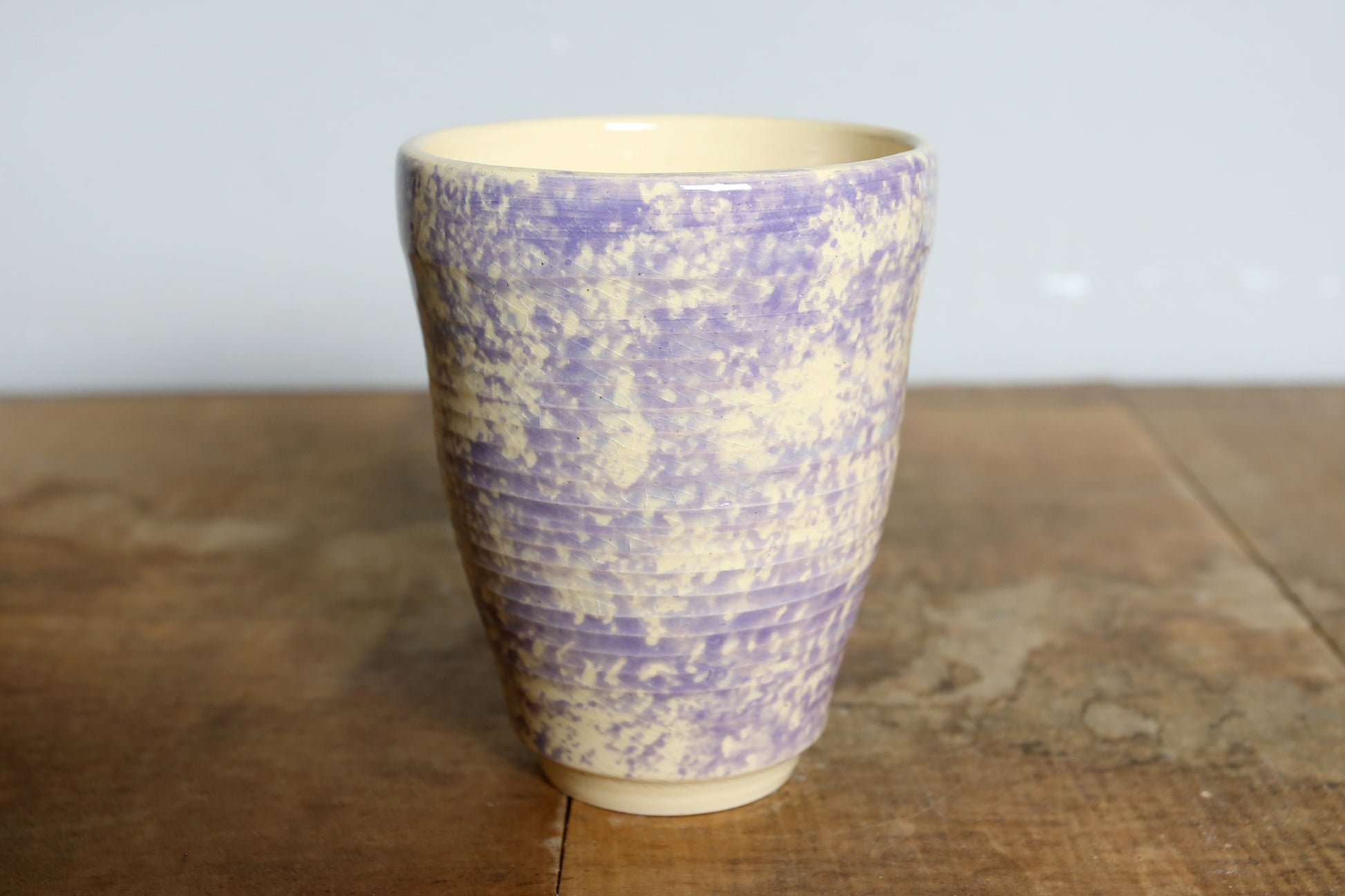 This purple cup was hand thrown on our potter’s wheel; then trimmed with joy. After a bisque firing, it was then brushed with a white glaze, and a purple glaze was applied with a sponging technique on the outside. A clear glaze was applied over the whole piece and it was fired in a kiln for a second time.