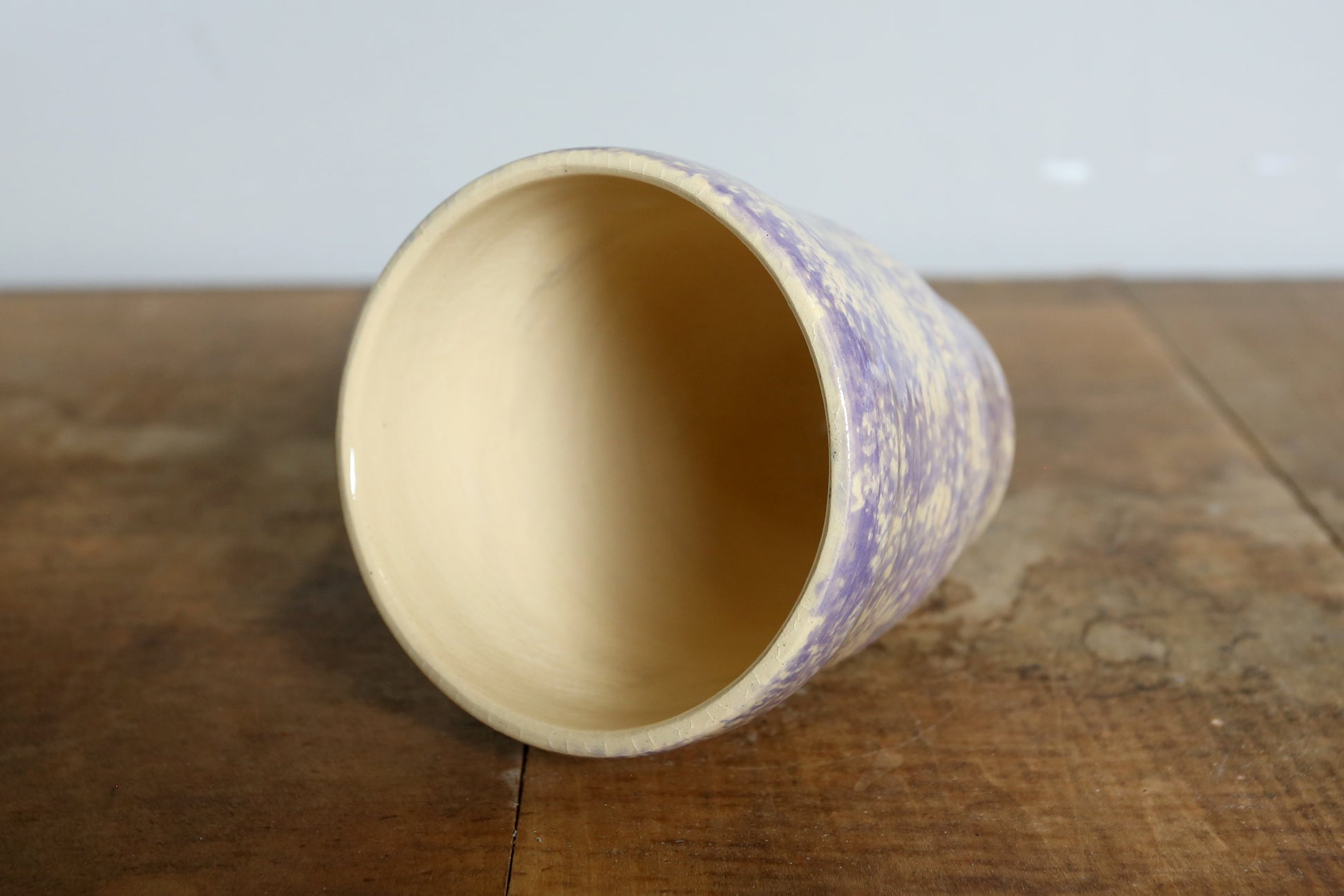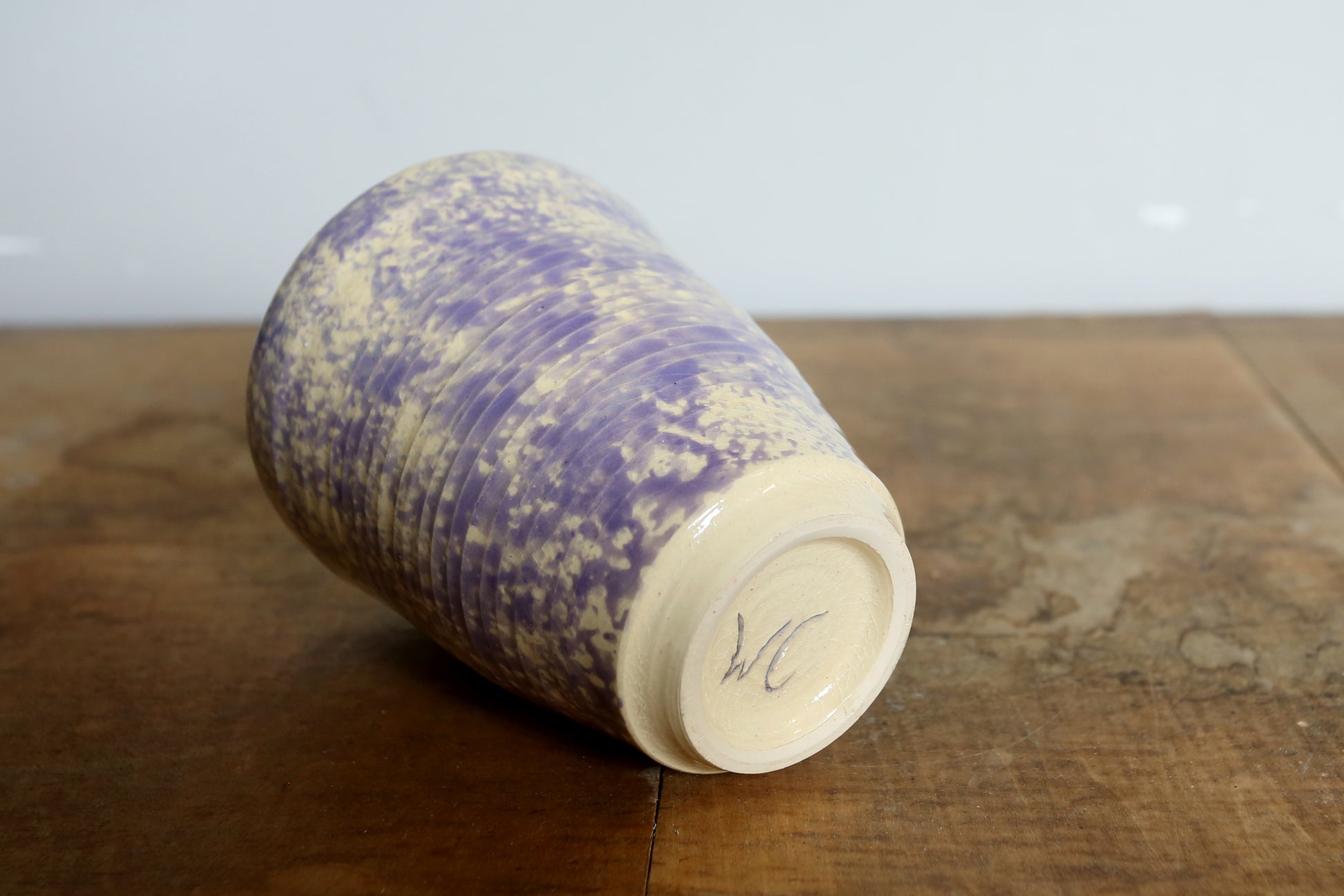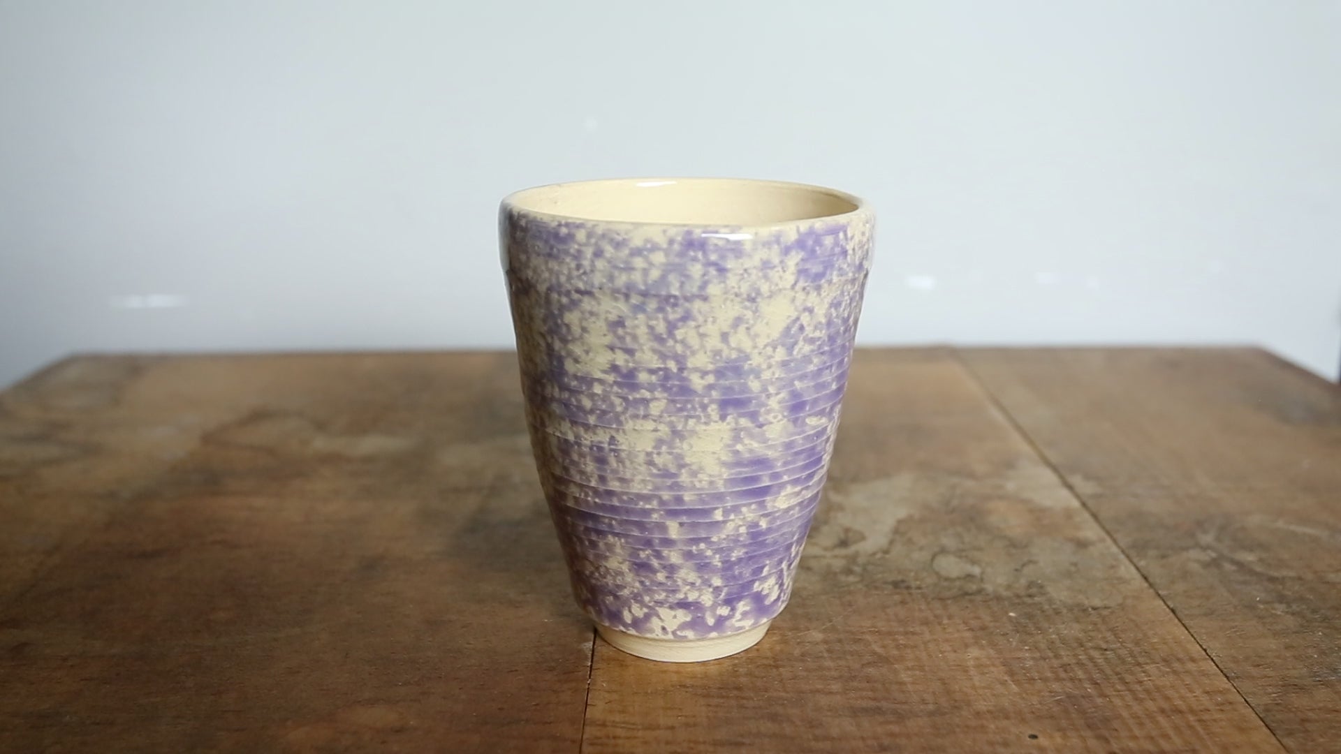 This purple cup was hand thrown on our potter’s wheel; then trimmed with joy. After a bisque firing, it was then brushed with a white glaze, and a purple glaze was applied with a sponging technique on the outside. A clear glaze was applied over the whole piece and it was fired in a kiln for a second time.