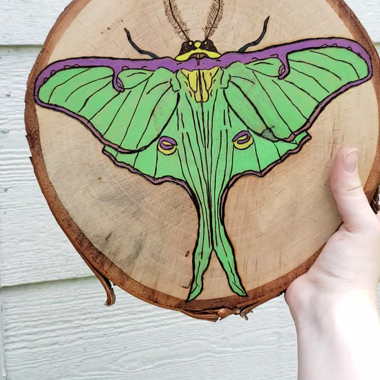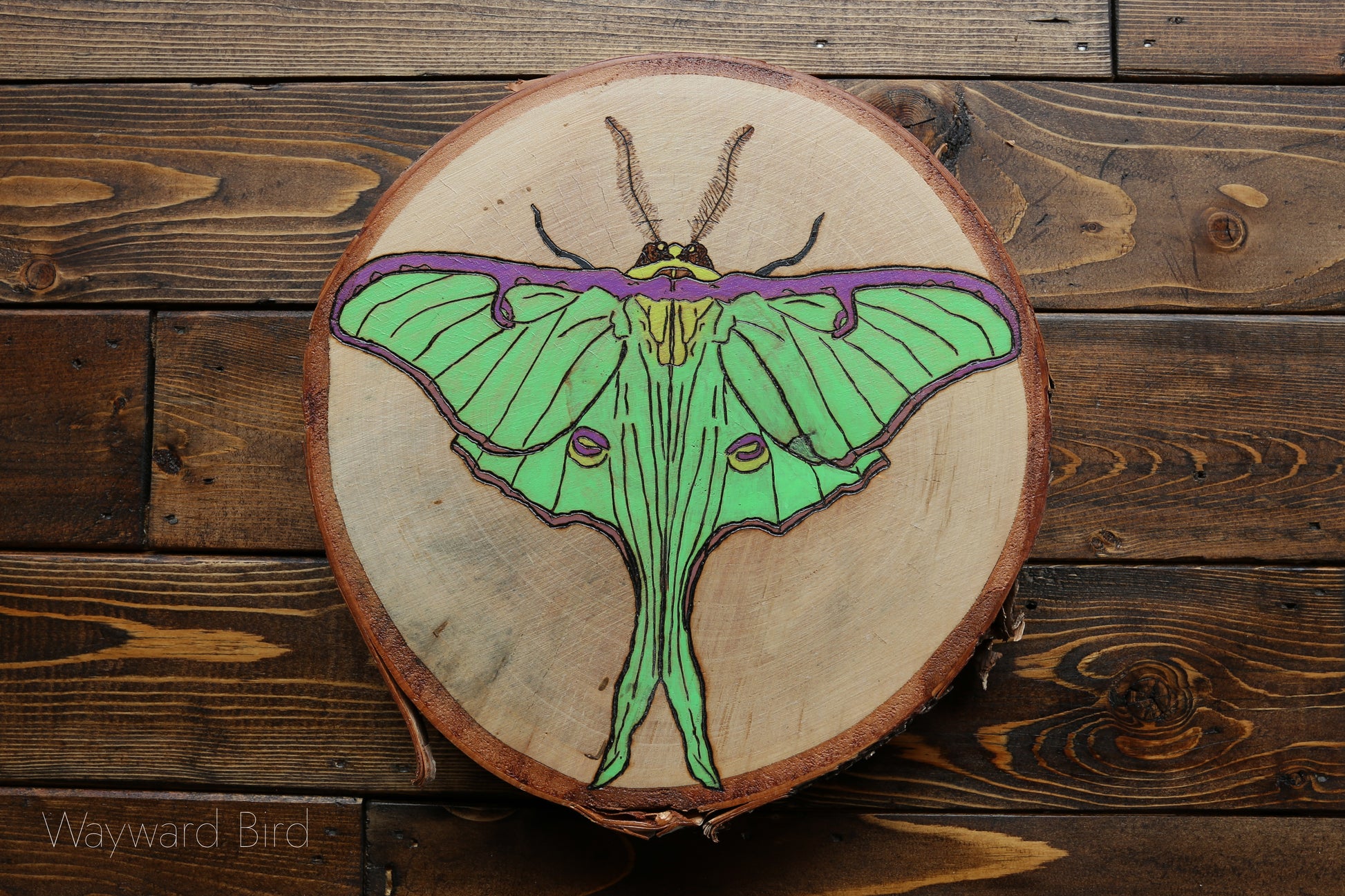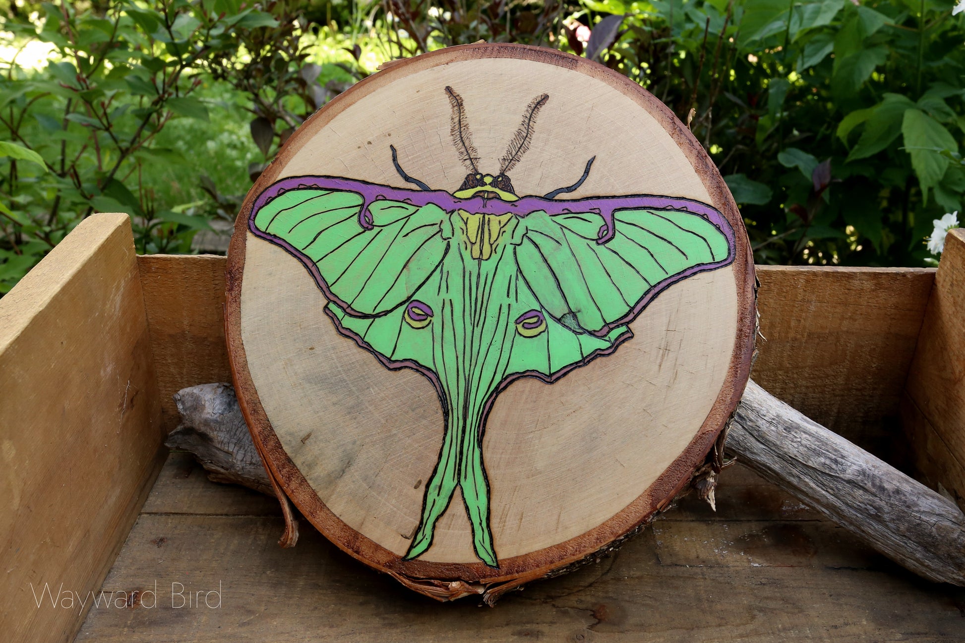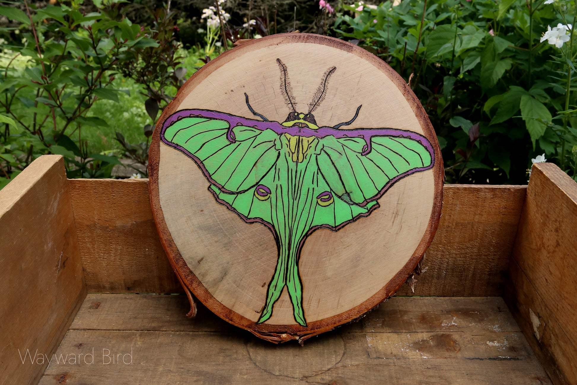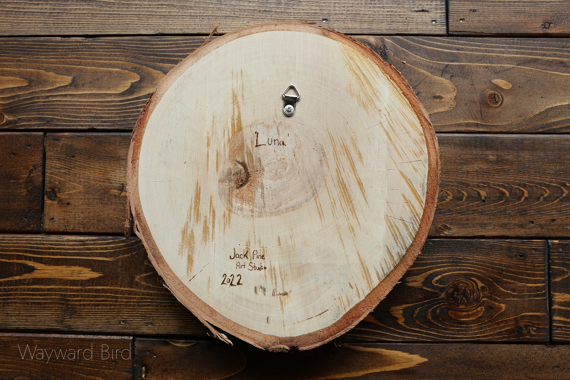 Luna is an original artwork hand-burned and painted on Birch by pyrography artist, Natasha Allen.