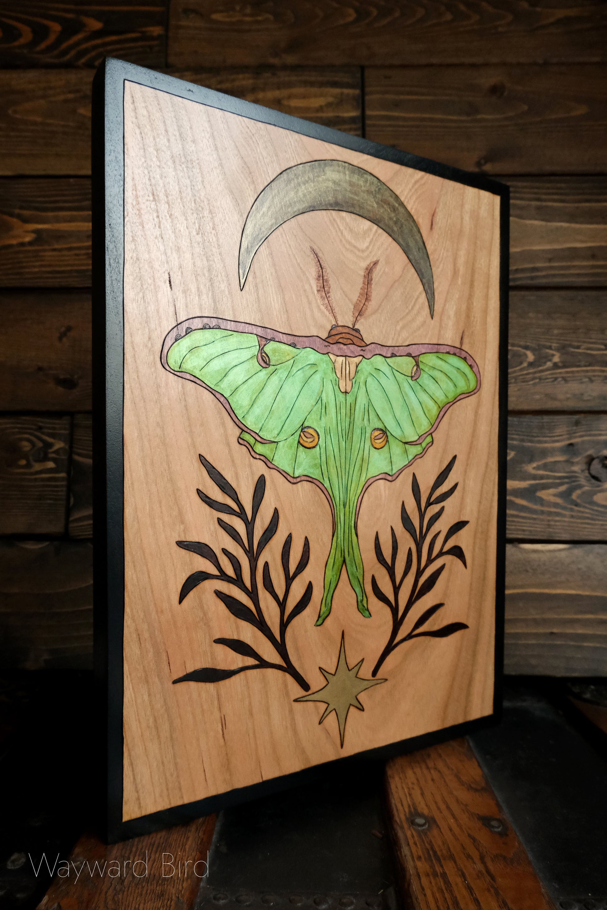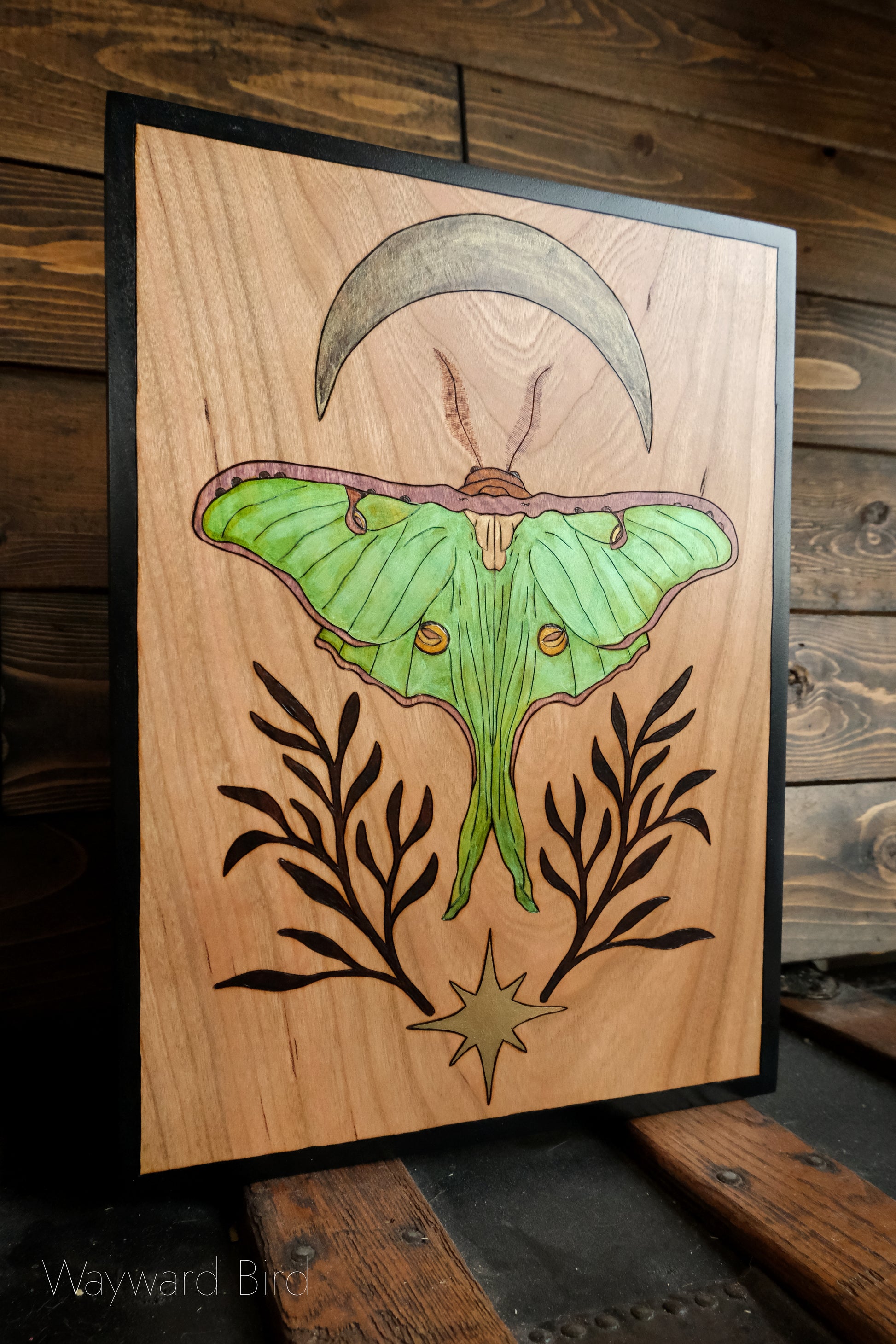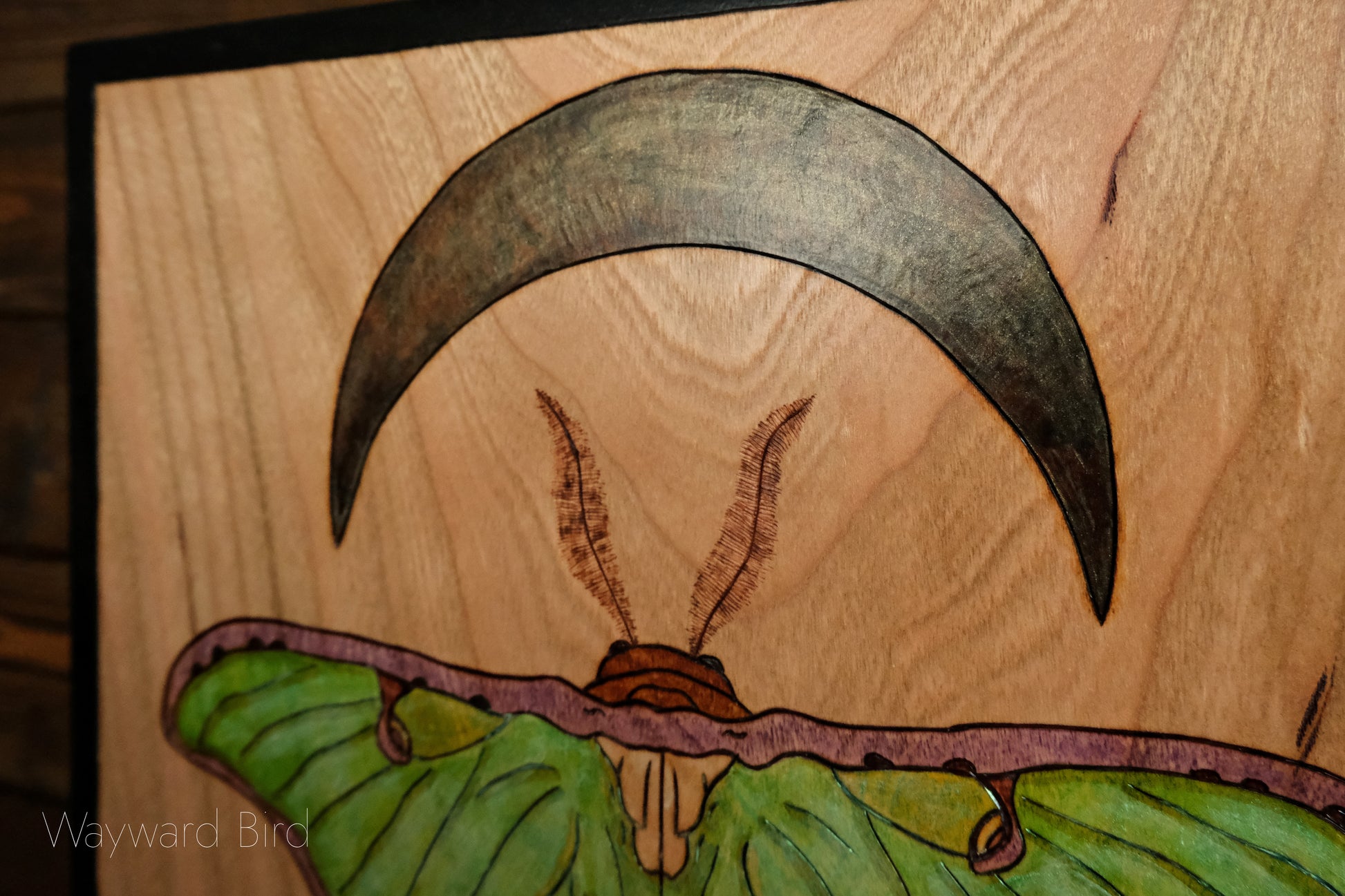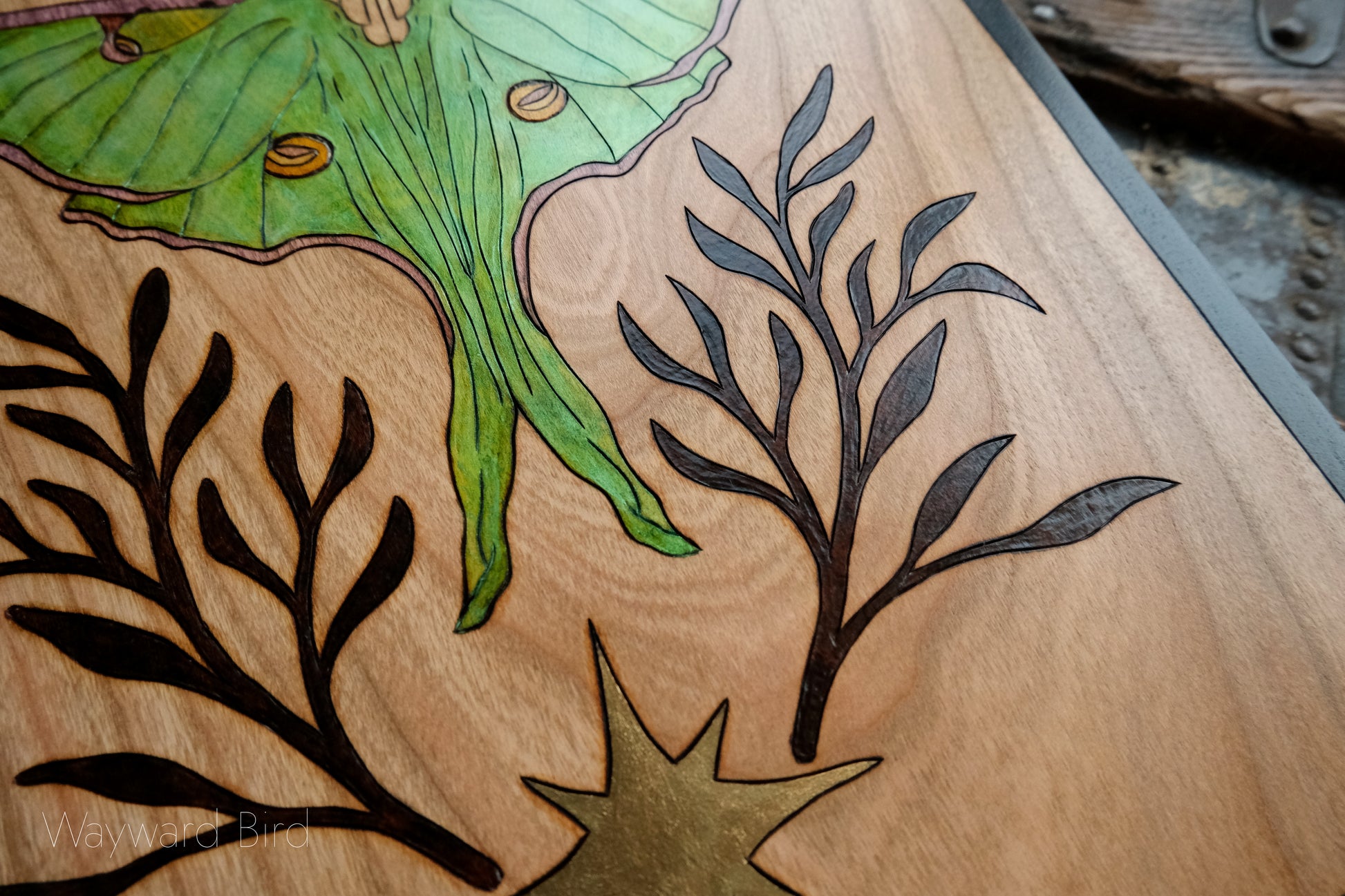 Lunar Radiance is an original artwork hand-burned and coloured on Cherry by pyrography artist, Natasha Allen.