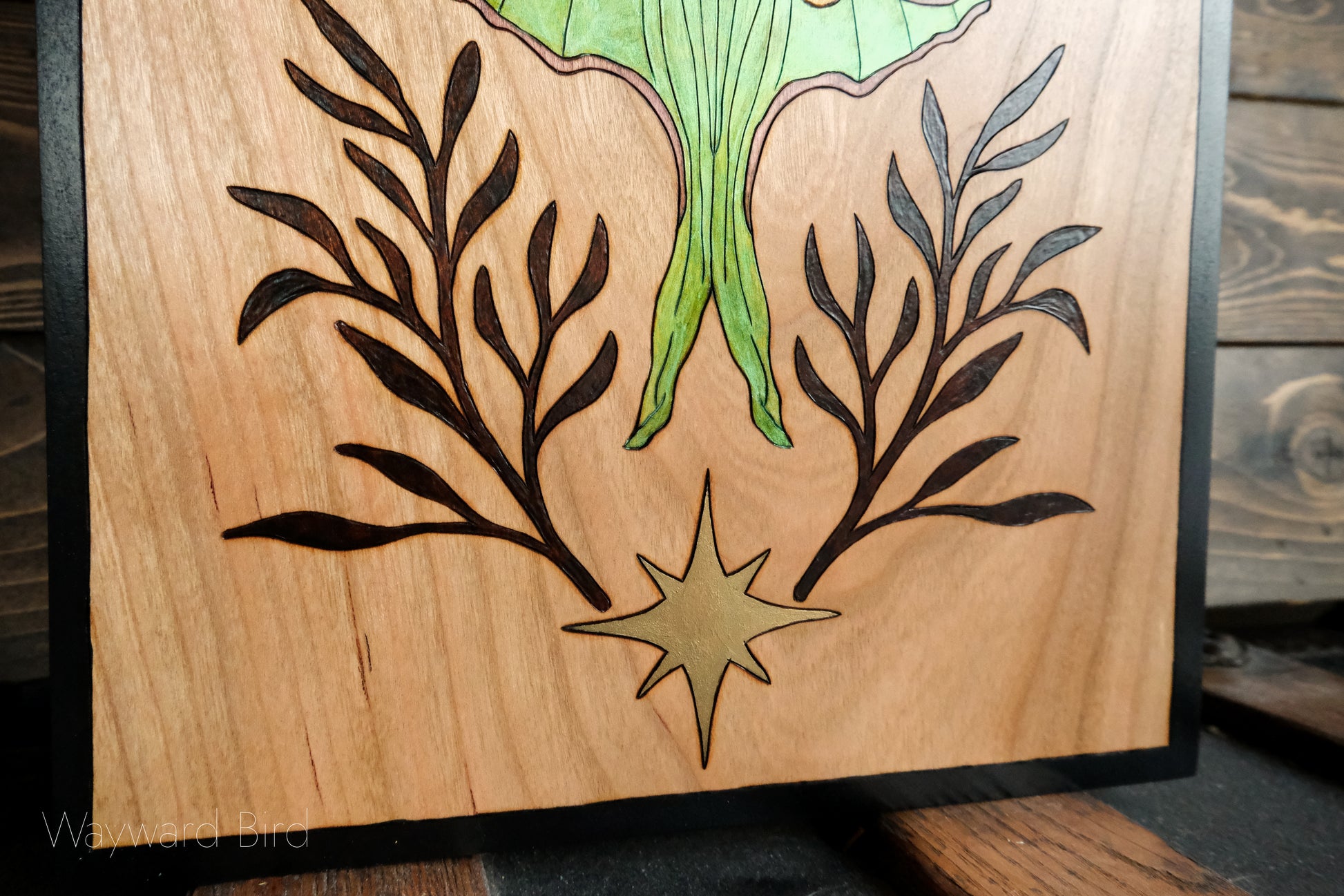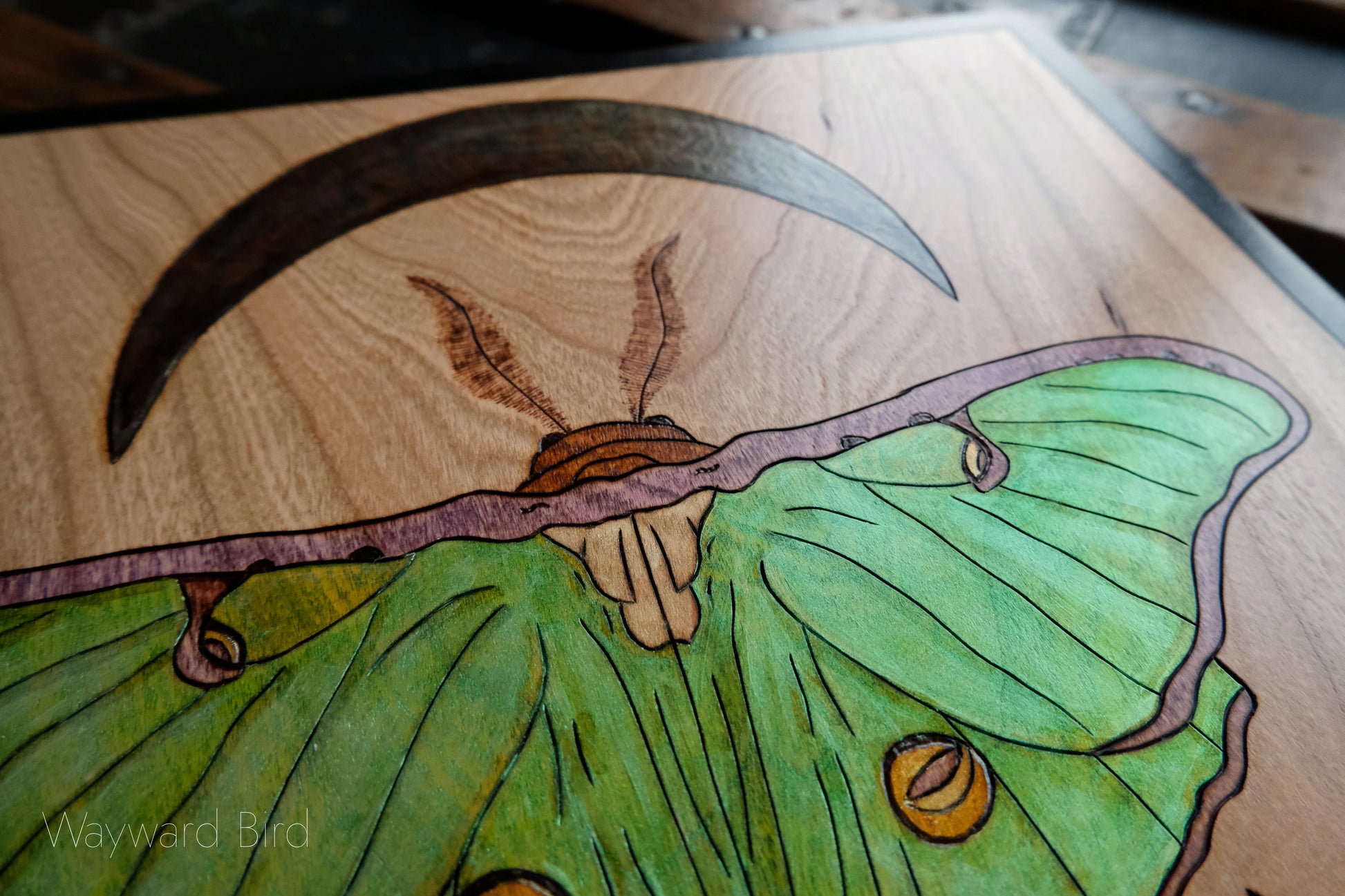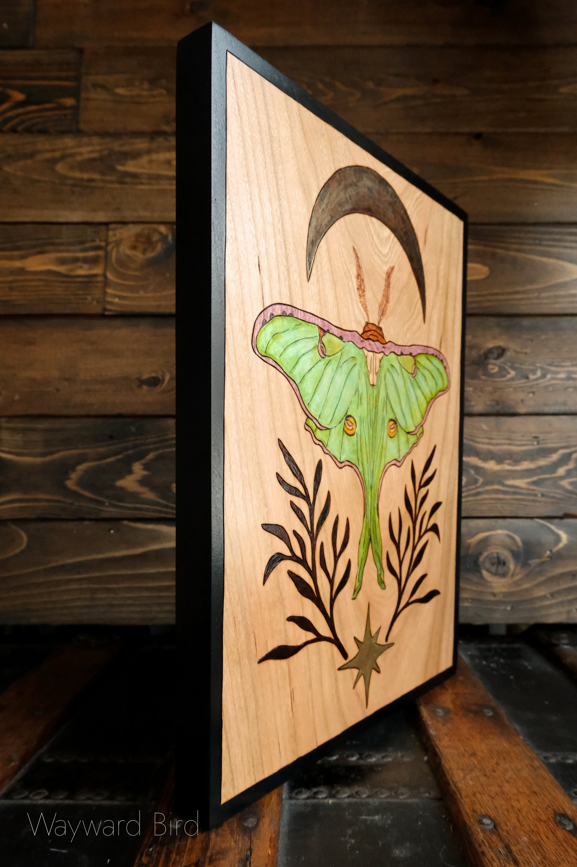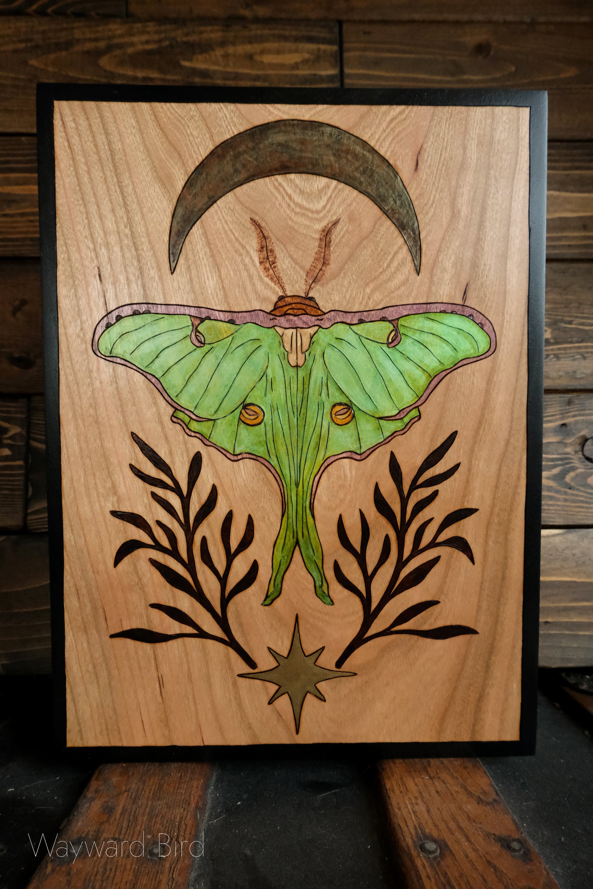 Lunar Radiance is an original artwork hand-burned and coloured on Cherry by pyrography artist, Natasha Allen.