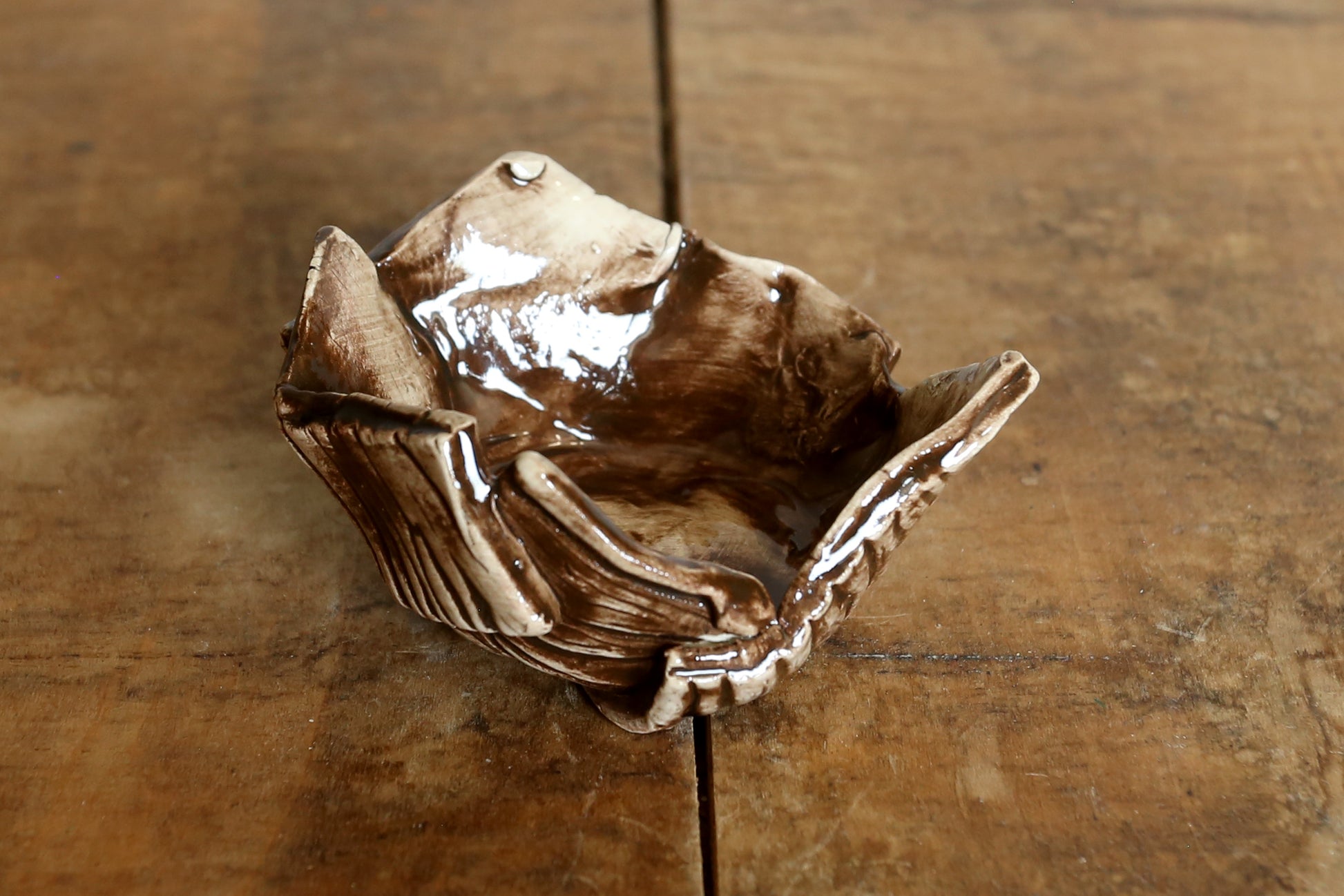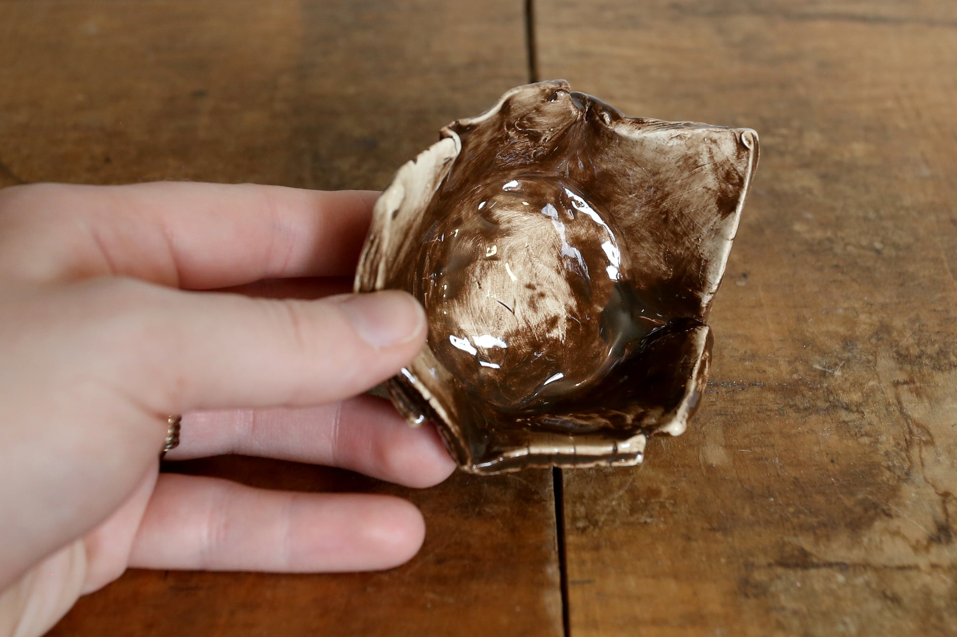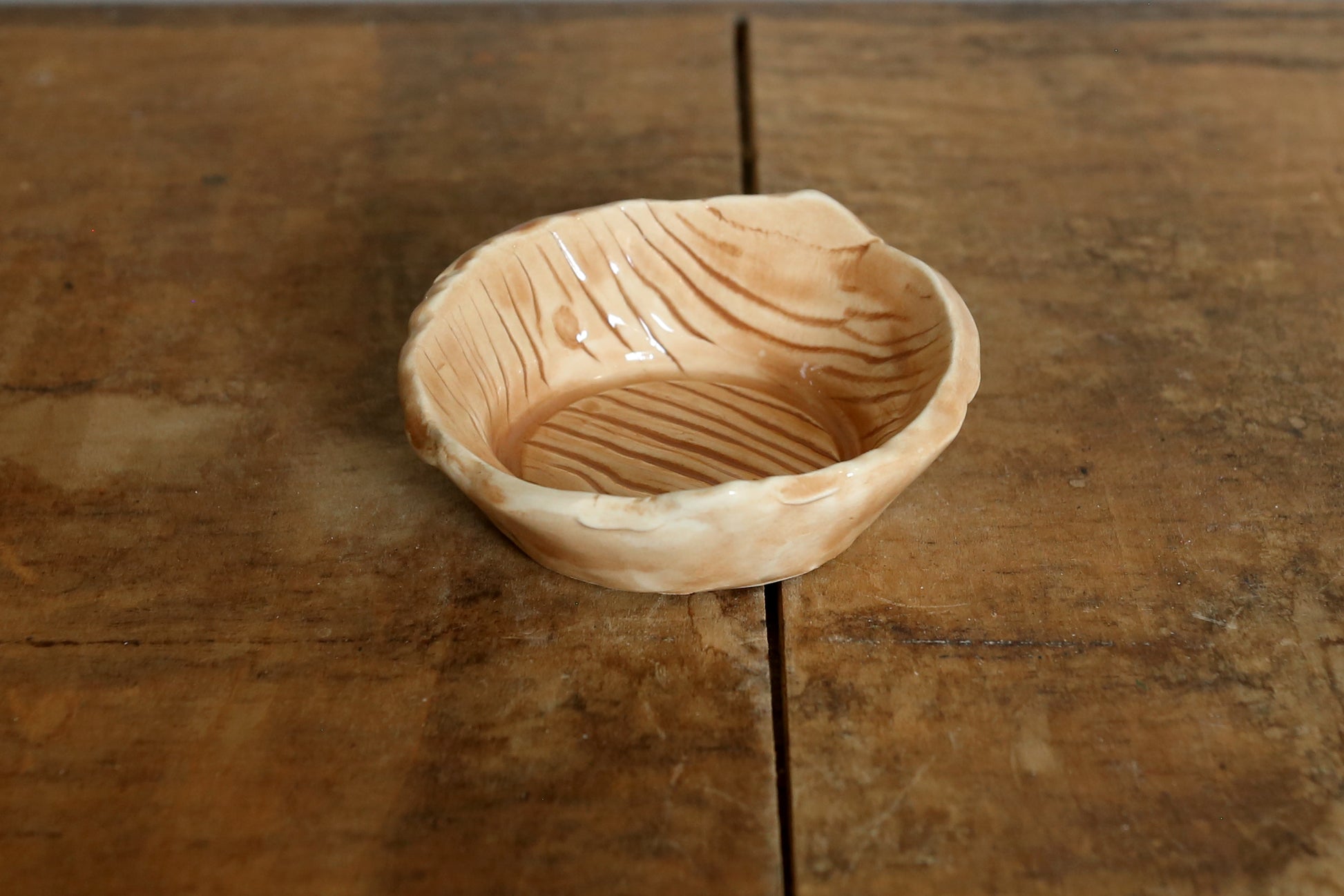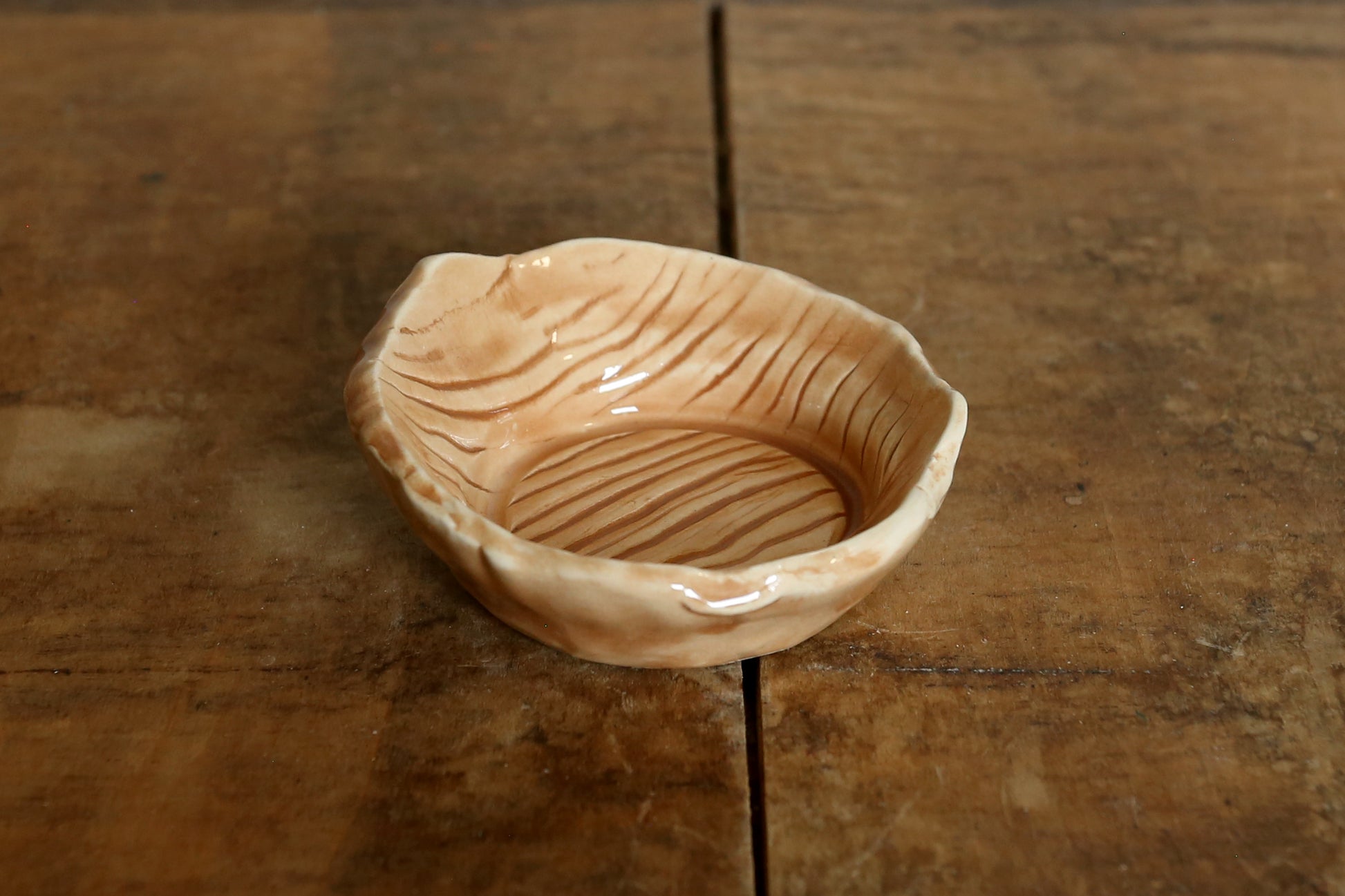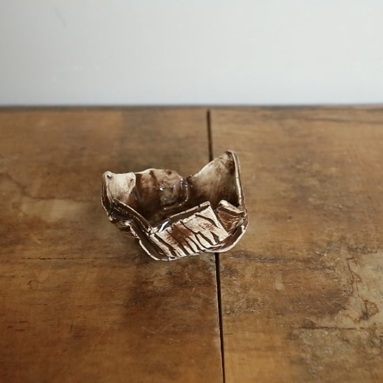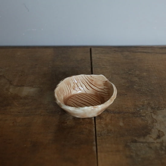 Hand-made ceramic ring dishes. Created with a wooden texture print then underglazed with either dark brown or light brown. Clear glazed over top.