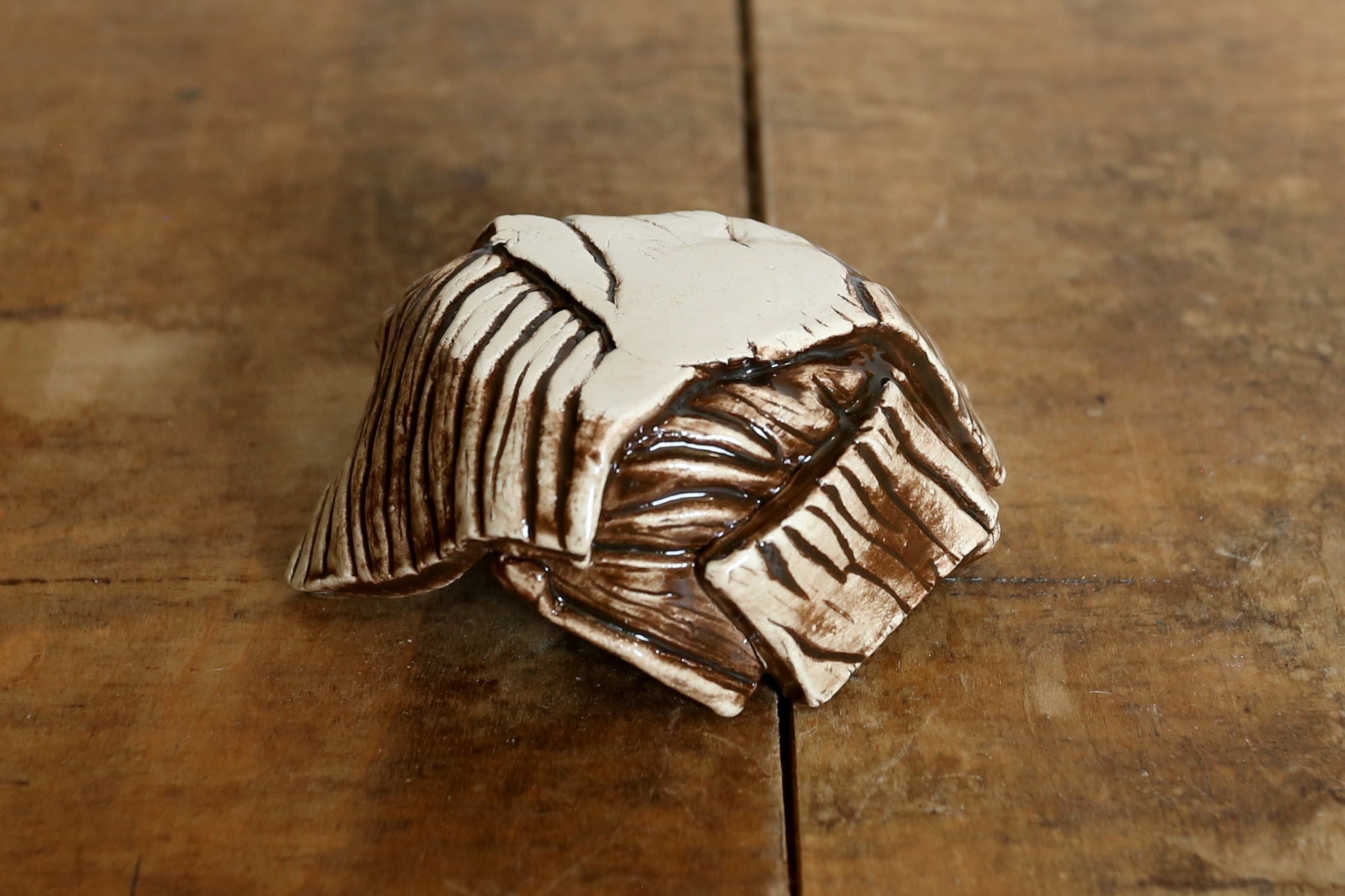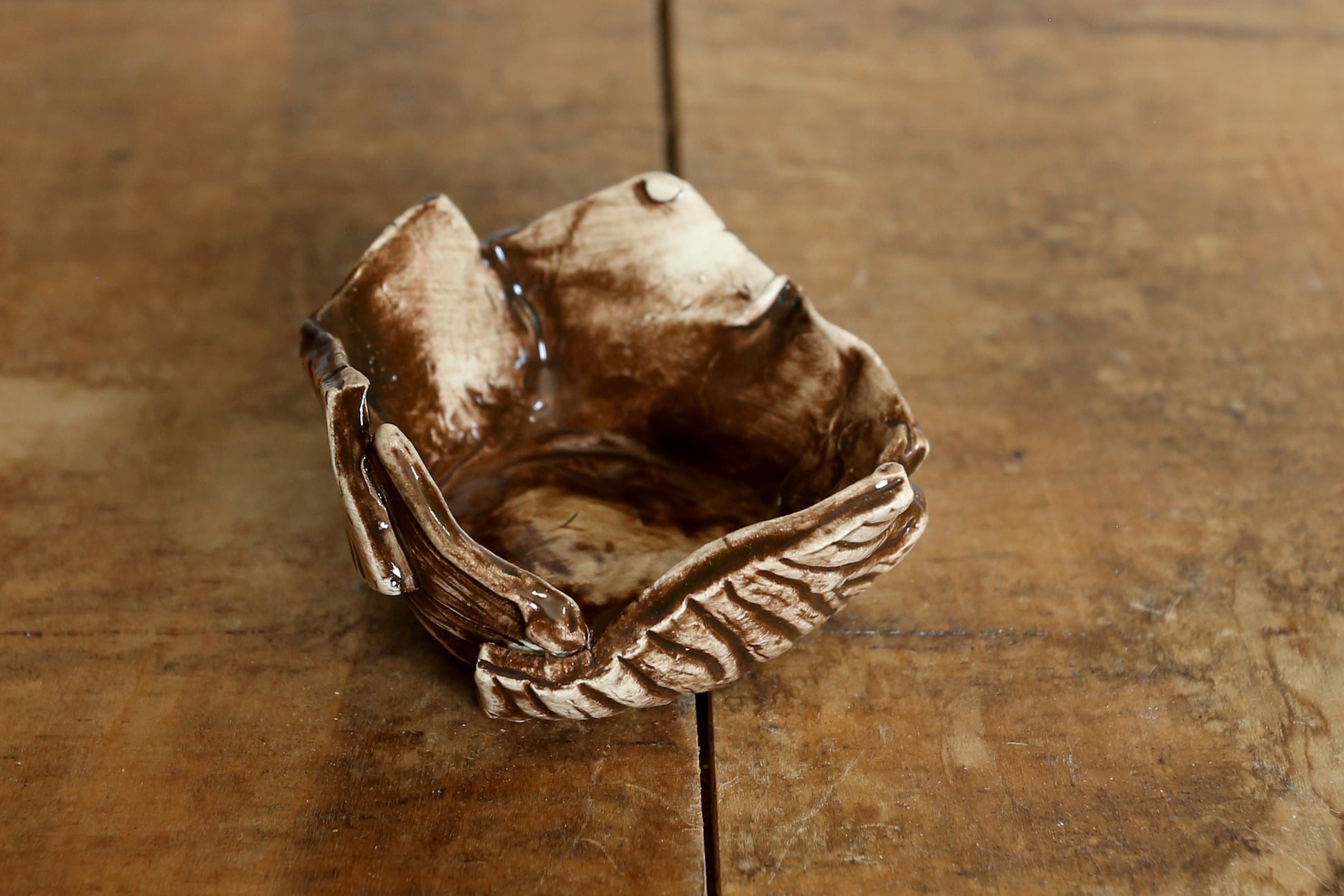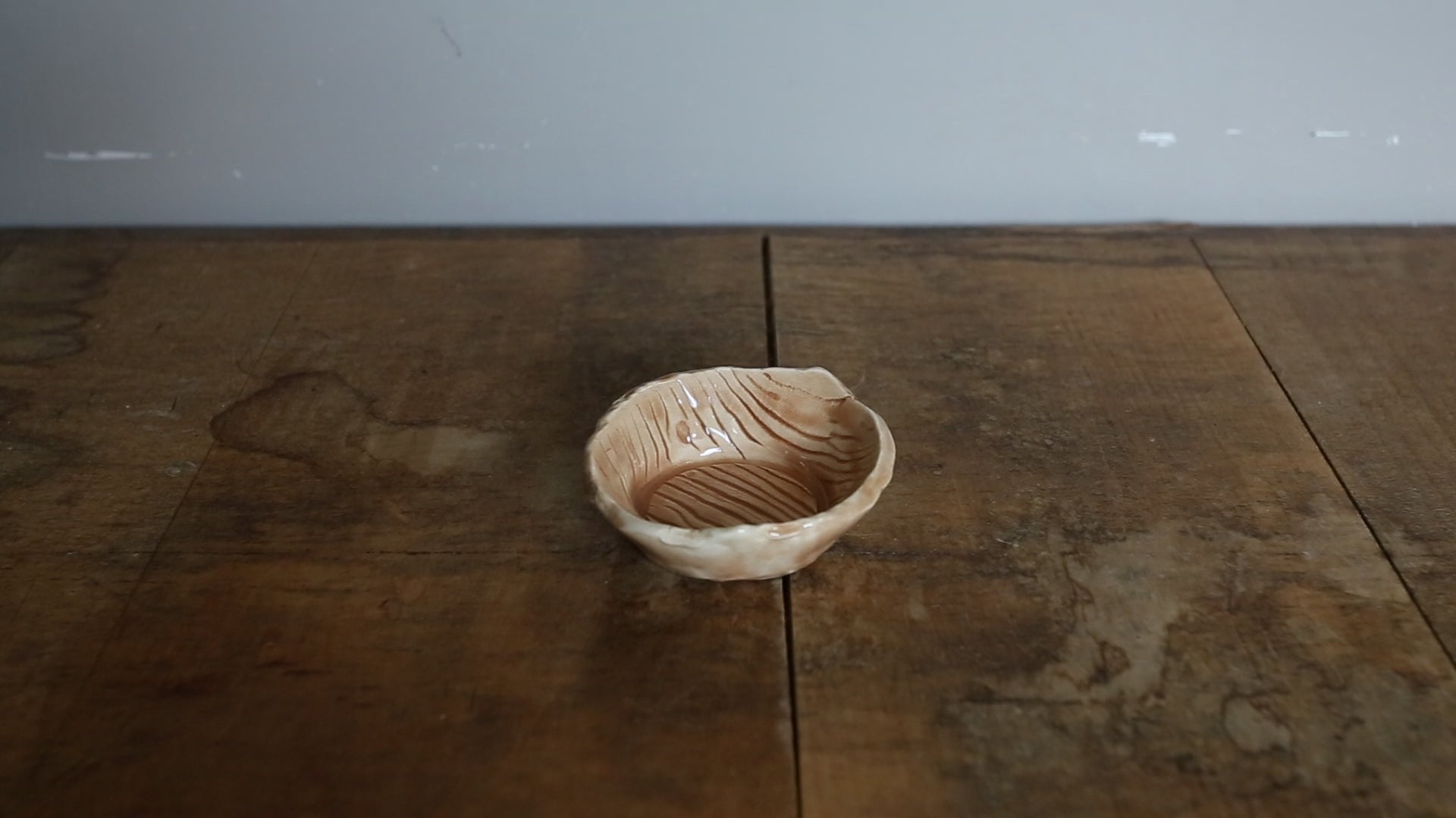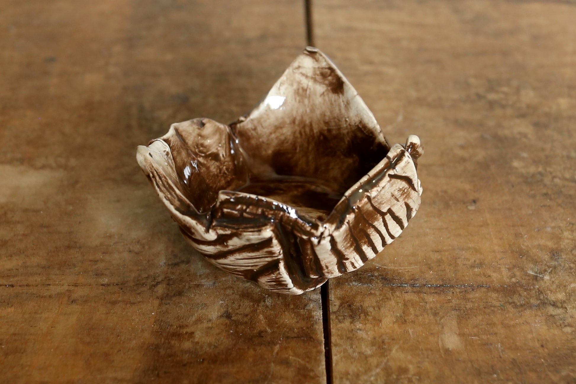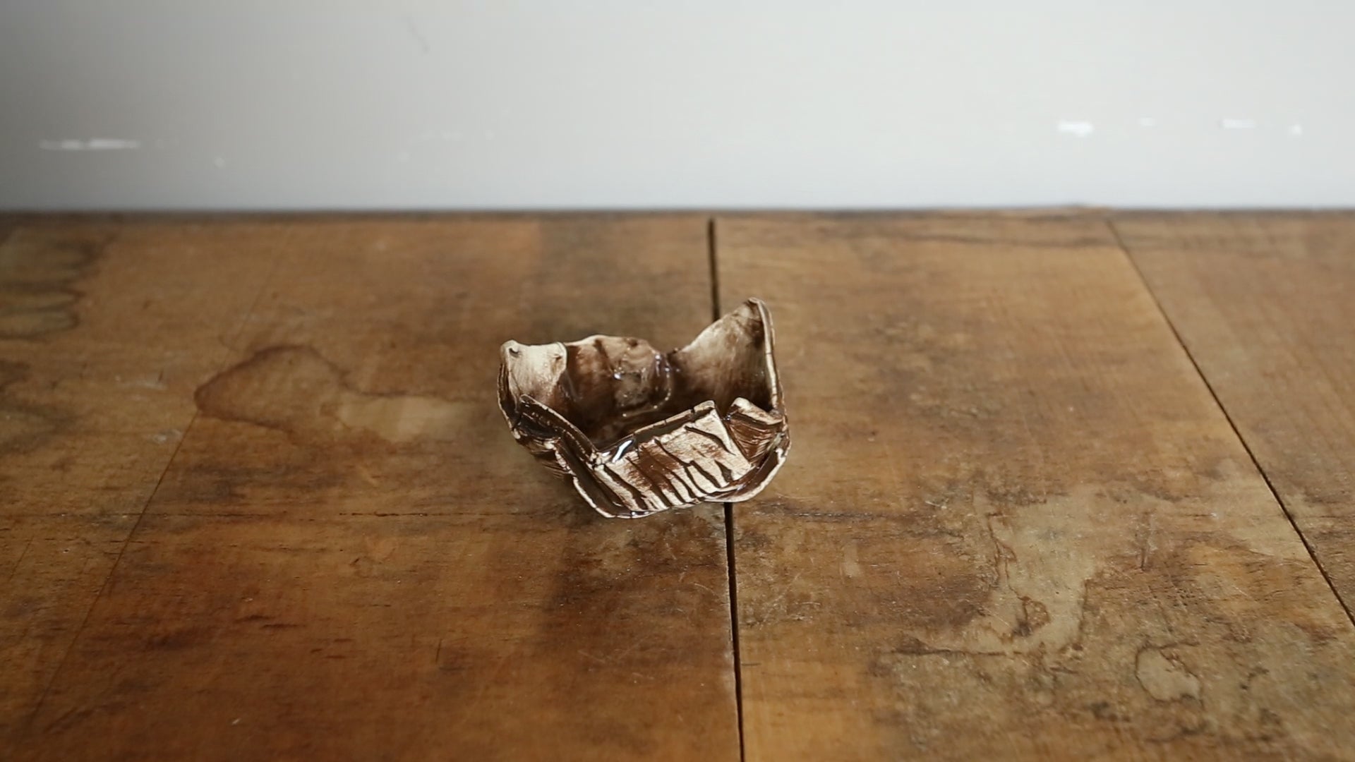 Hand-made ceramic ring dishes. Created with a wooden texture print then underglazed with either dark brown or light brown. Clear glazed over top.