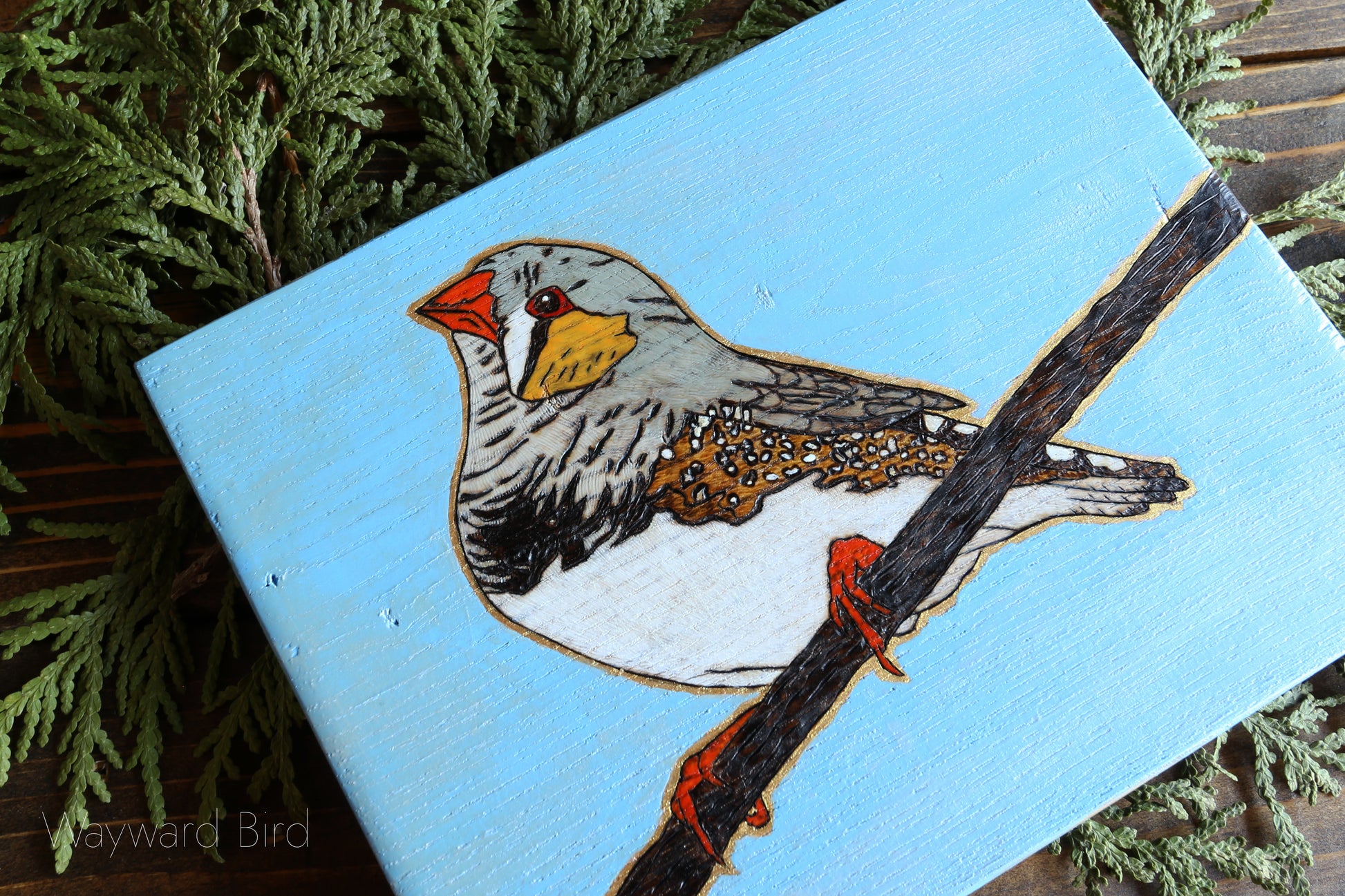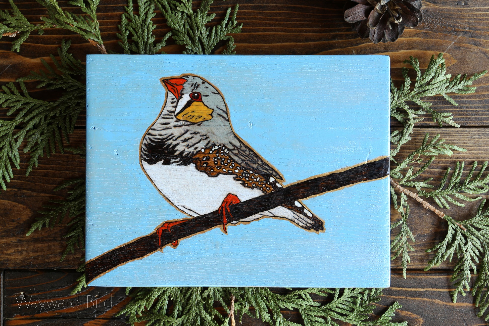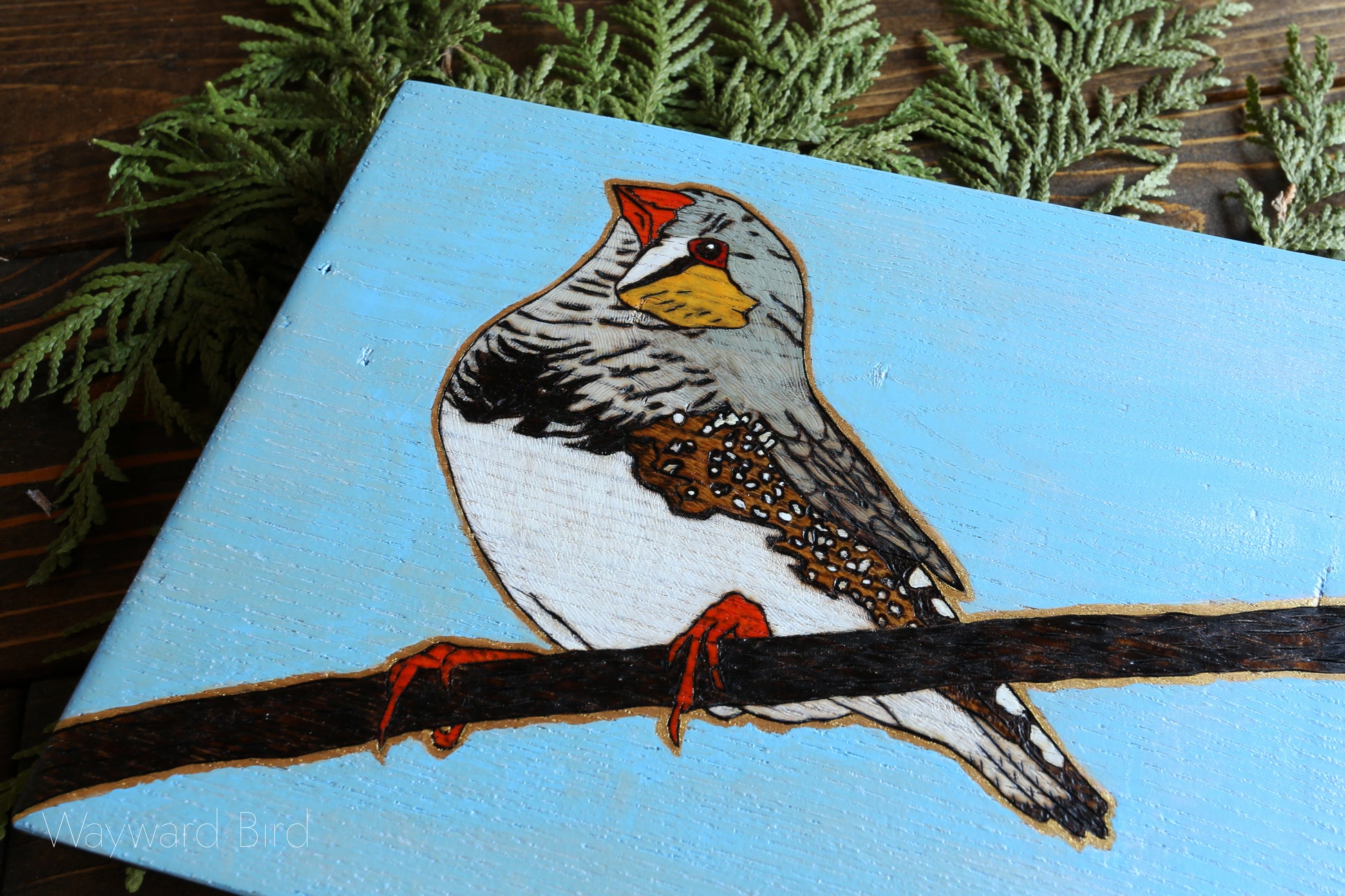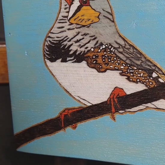 Zebra Finch is an original artwork hand-burned and painted on Black Ash by pyrography artist, Natasha Allen. The blue background is painted with an iridescent paint which shines in the light, please refer to the video to see this in action.
