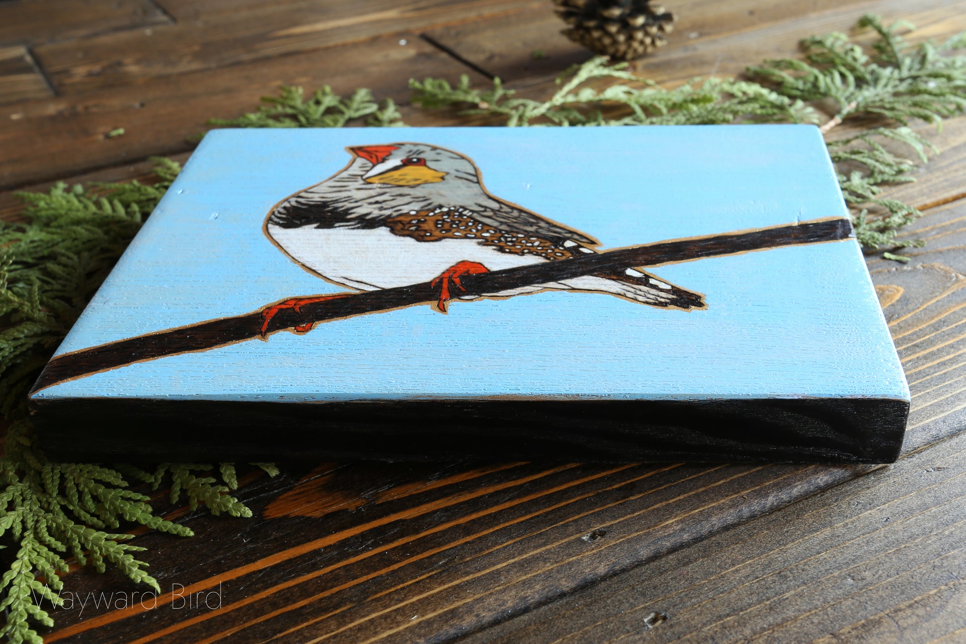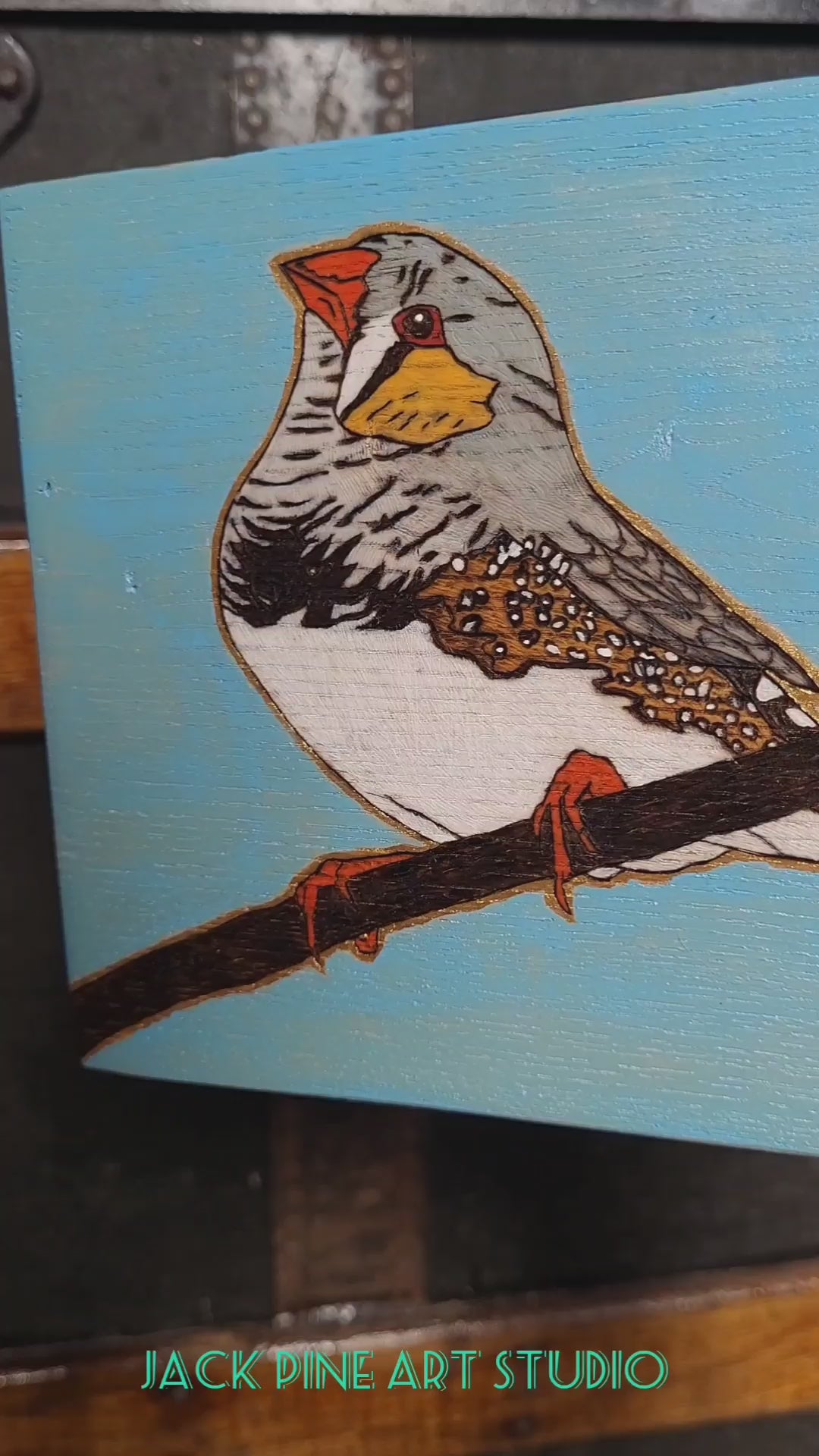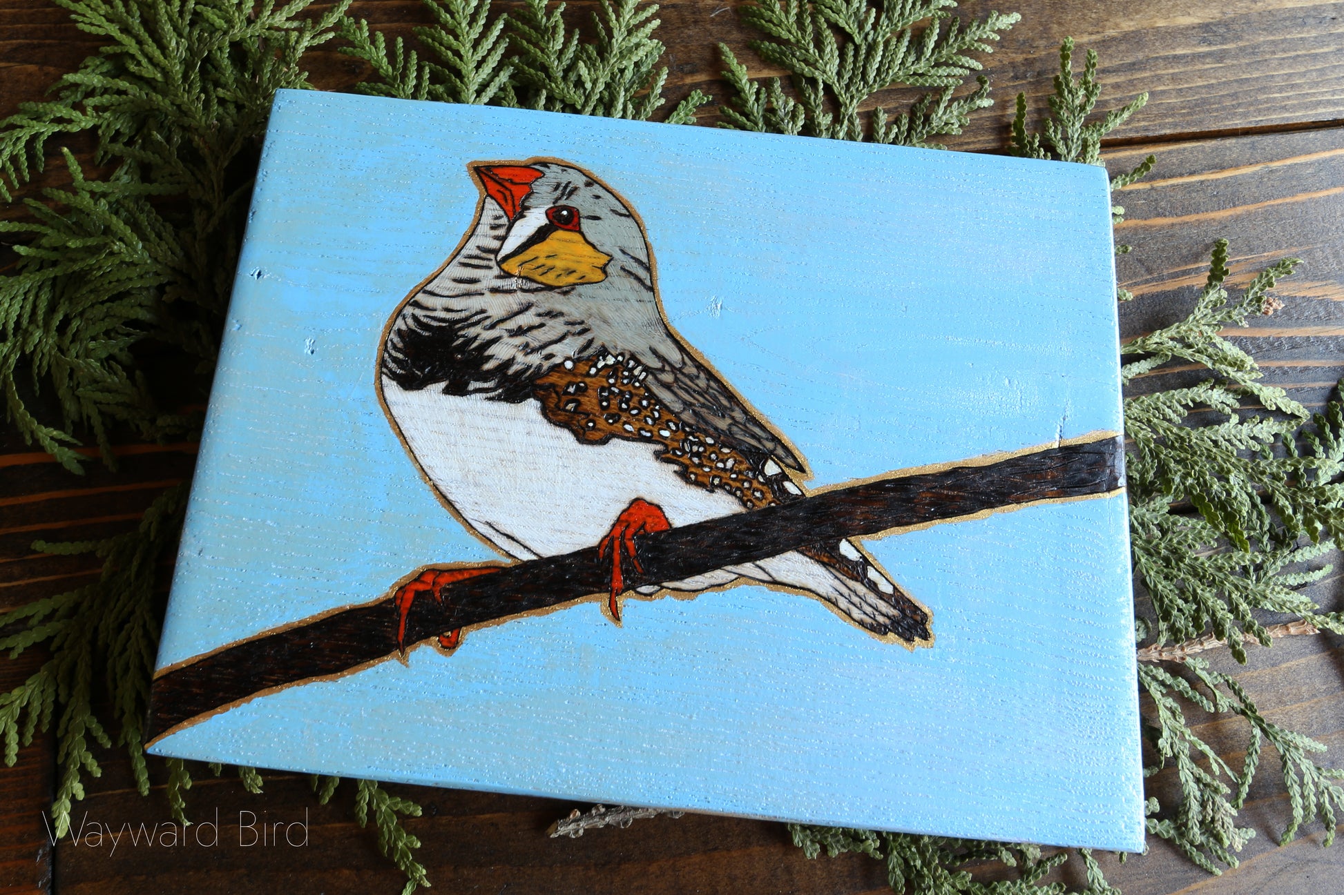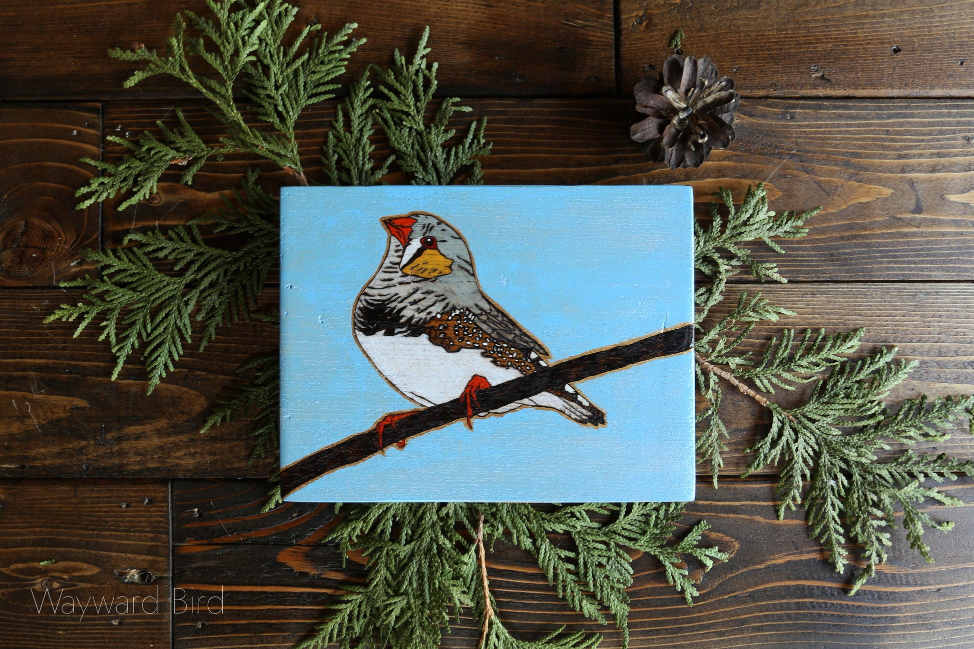 Zebra Finch is an original artwork hand-burned and painted on Black Ash by pyrography artist, Natasha Allen. The blue background is painted with an iridescent paint which shines in the light, please refer to the video to see this in action.