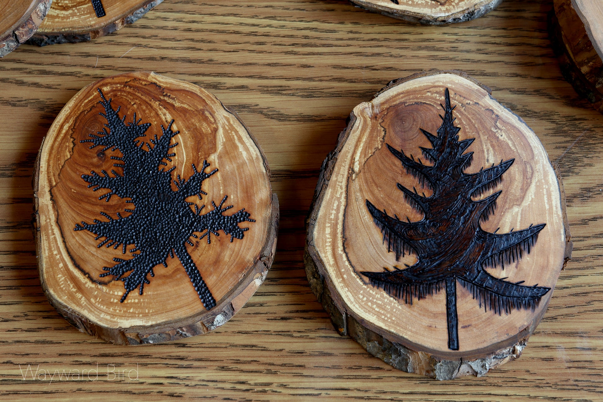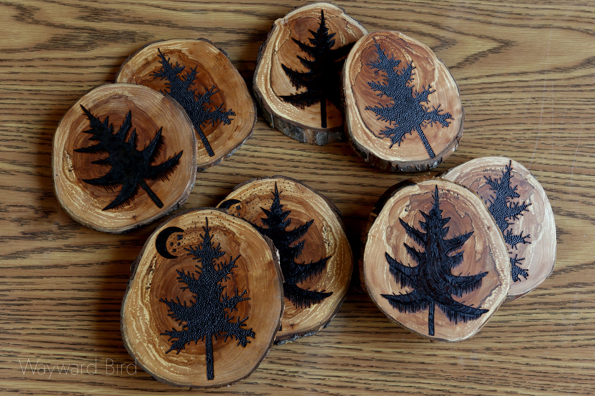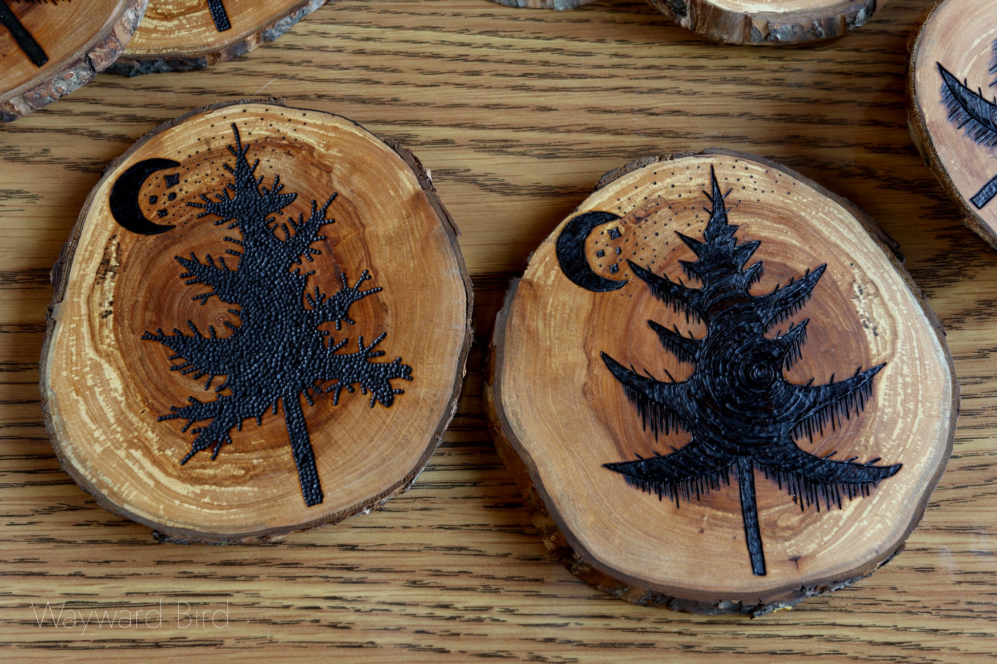 Coaster sets with a hand-burned pine tree illustration on sustainably sourced red pine by pyrography artist, Natasha Allen.