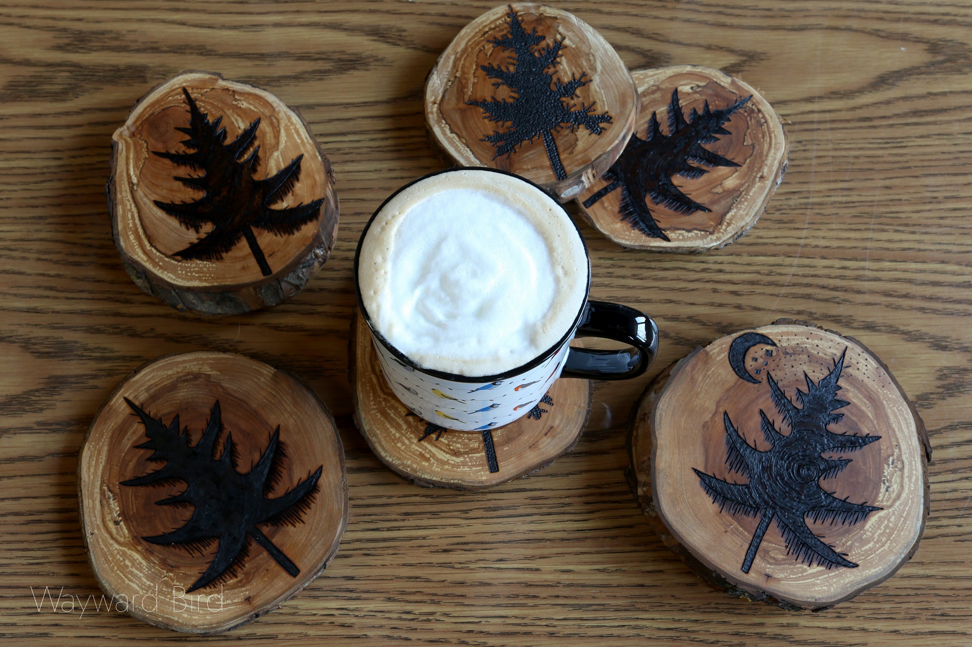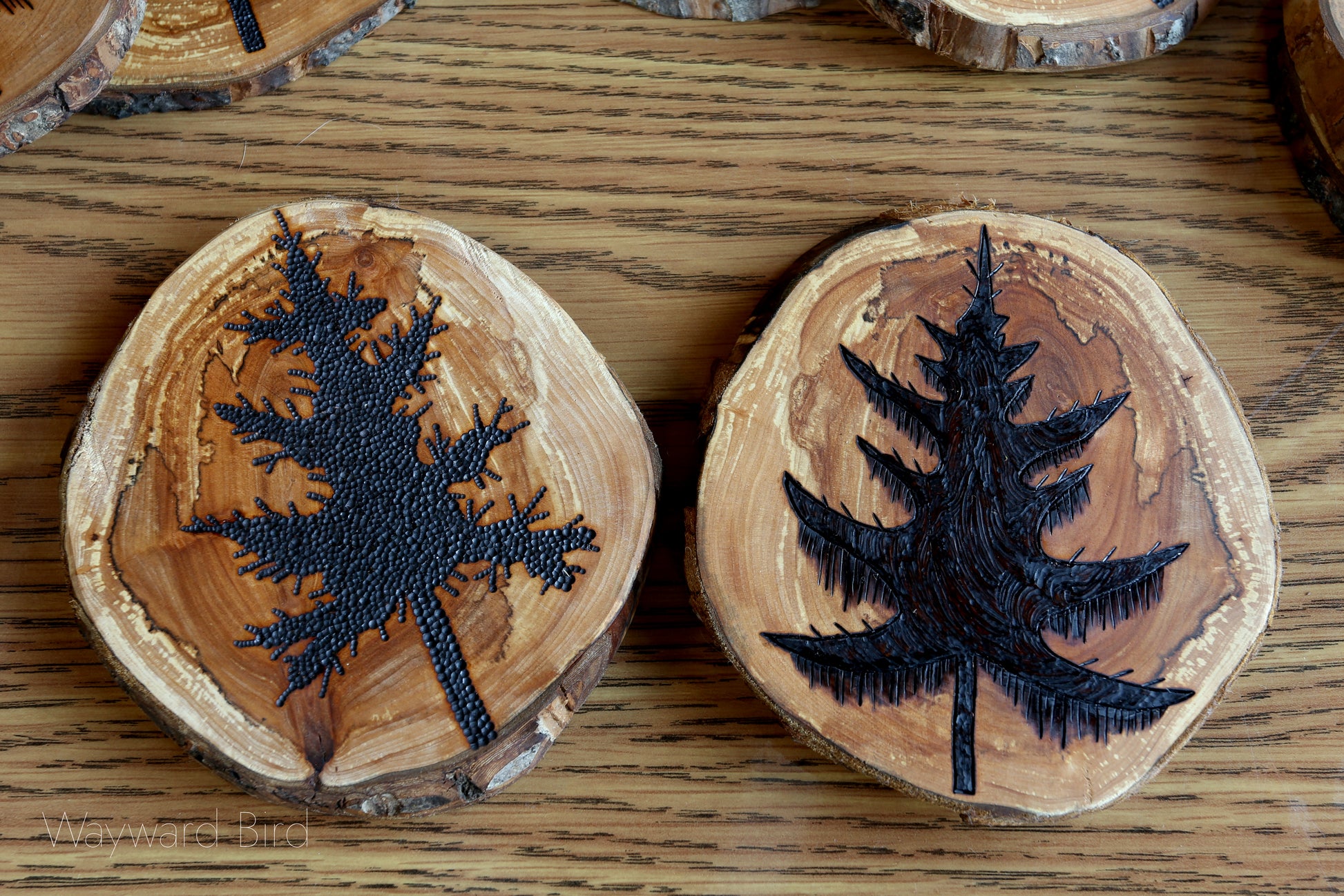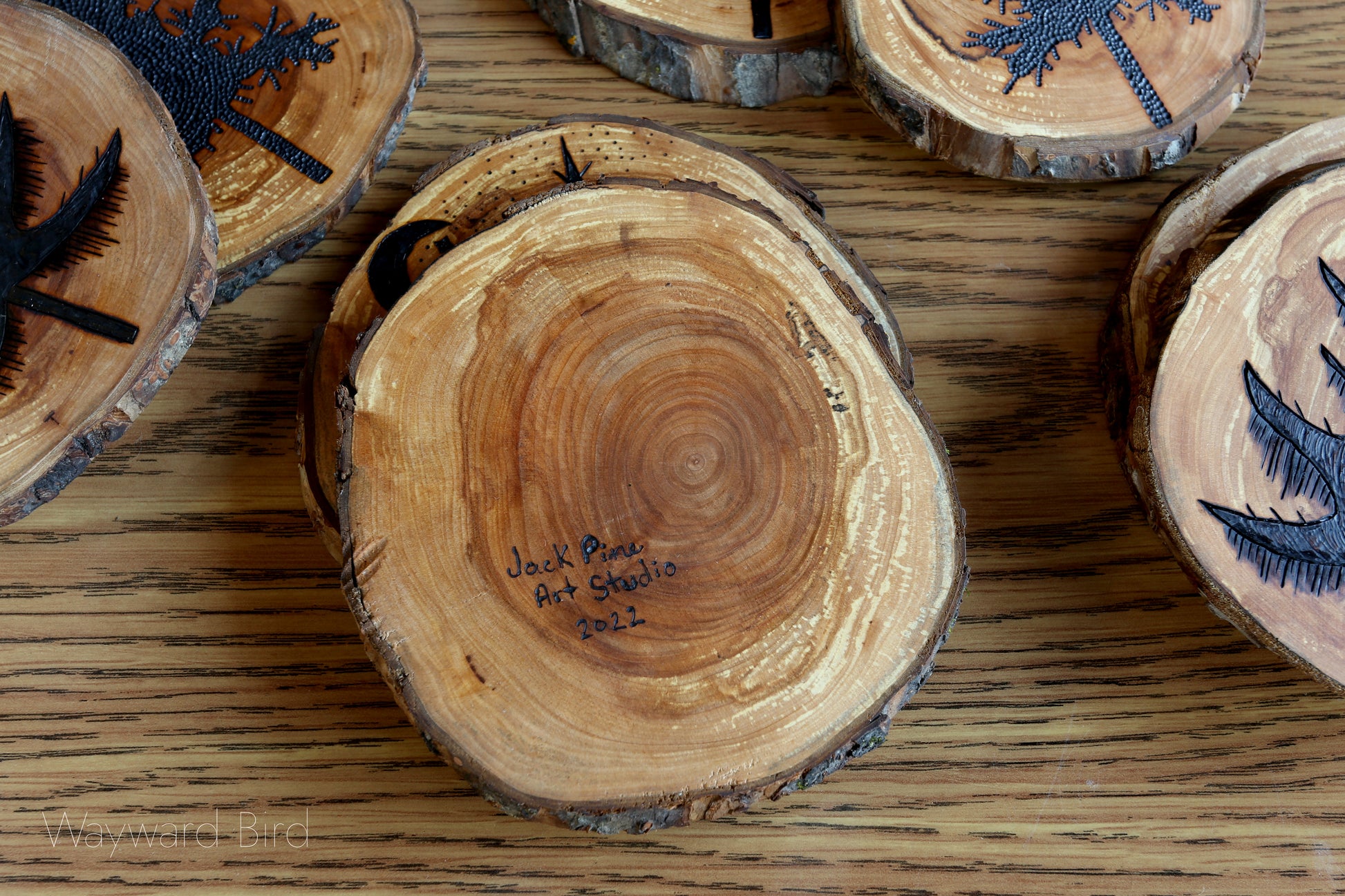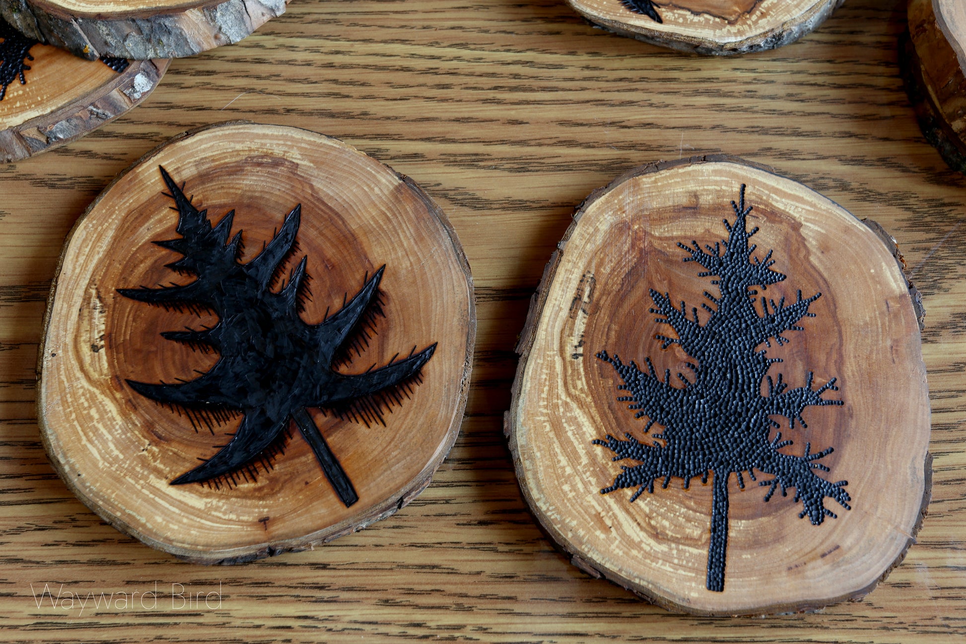 Coaster sets with a hand-burned pine tree illustration on sustainably sourced red pine by pyrography artist, Natasha Allen.