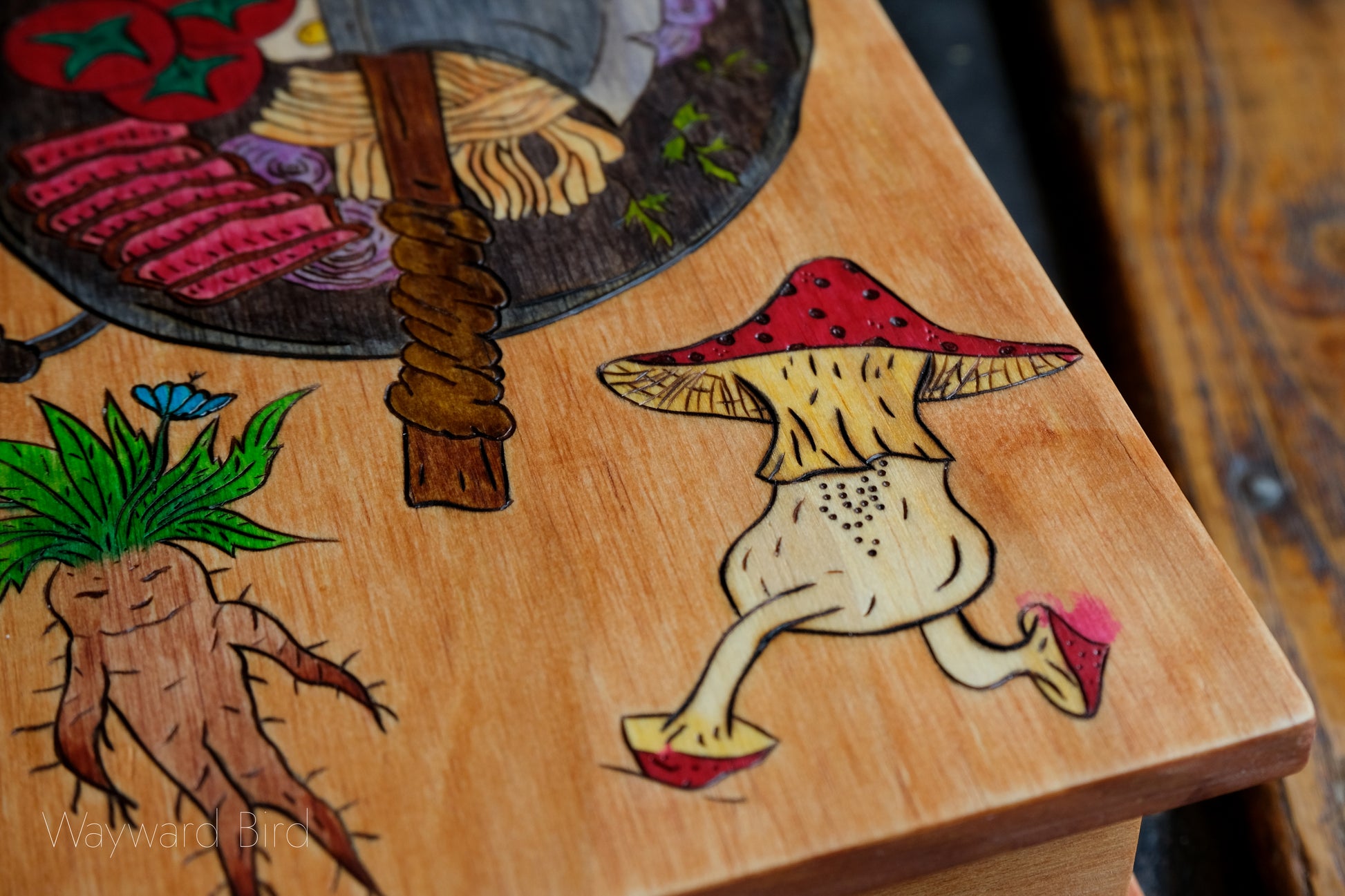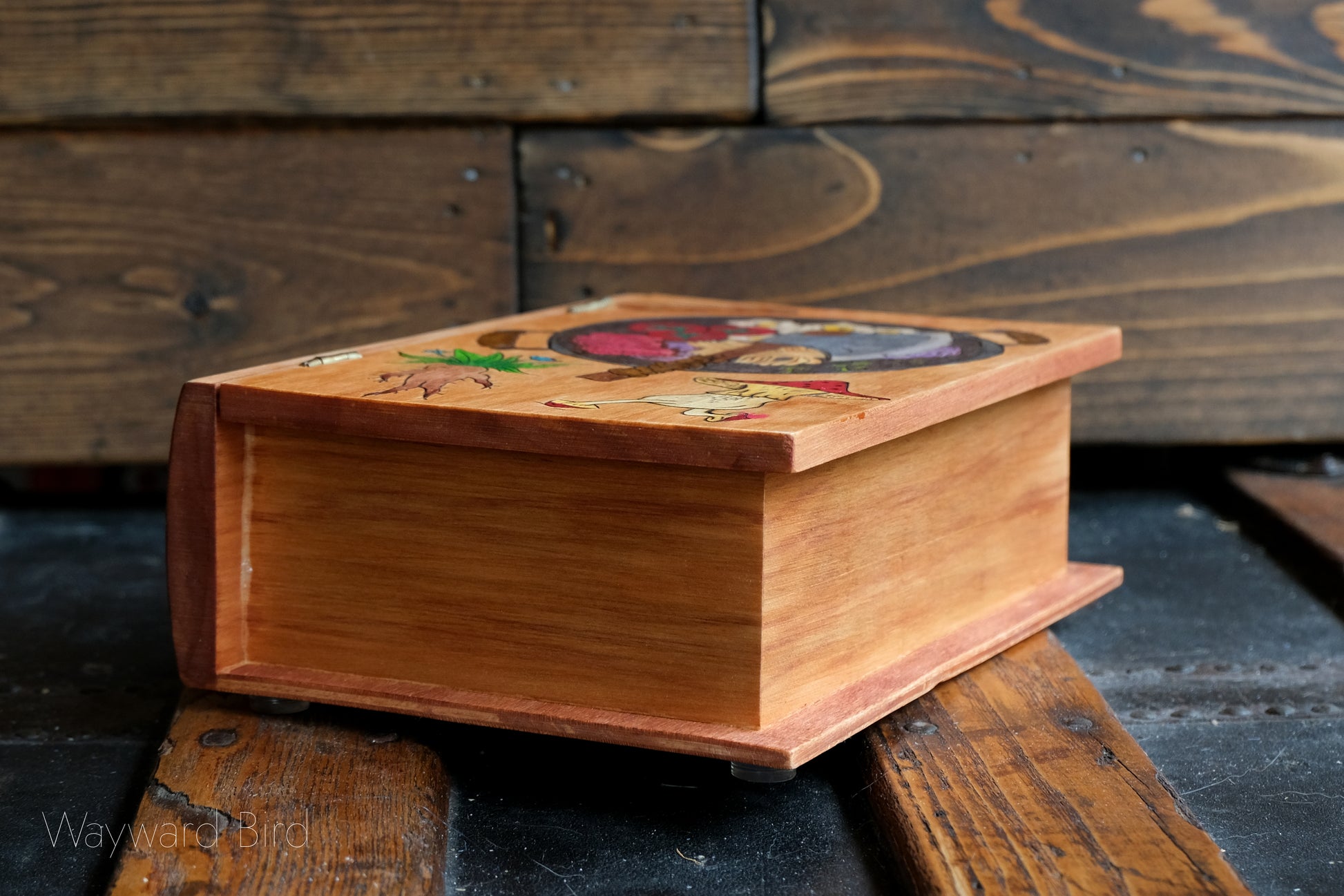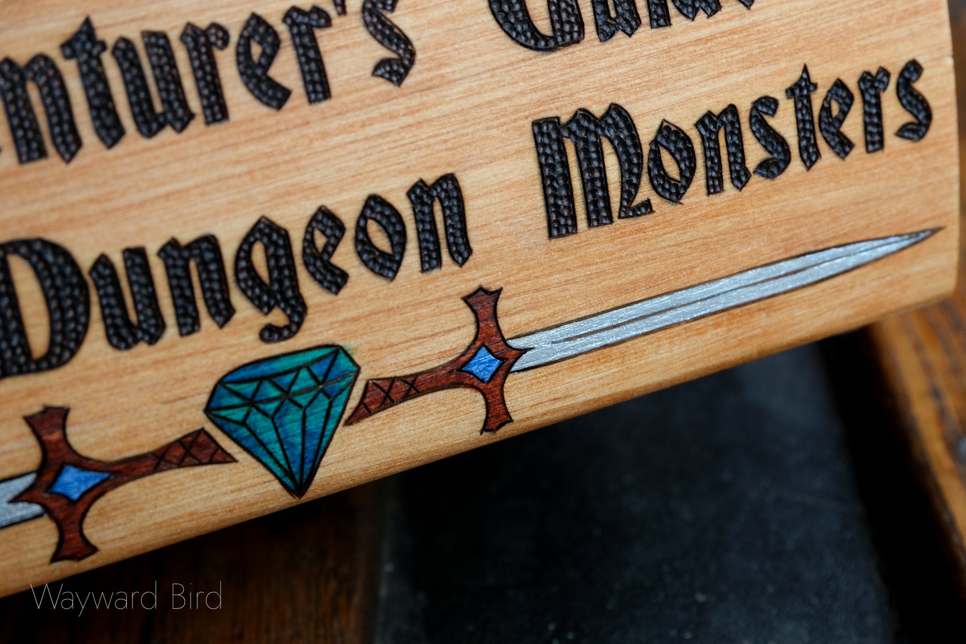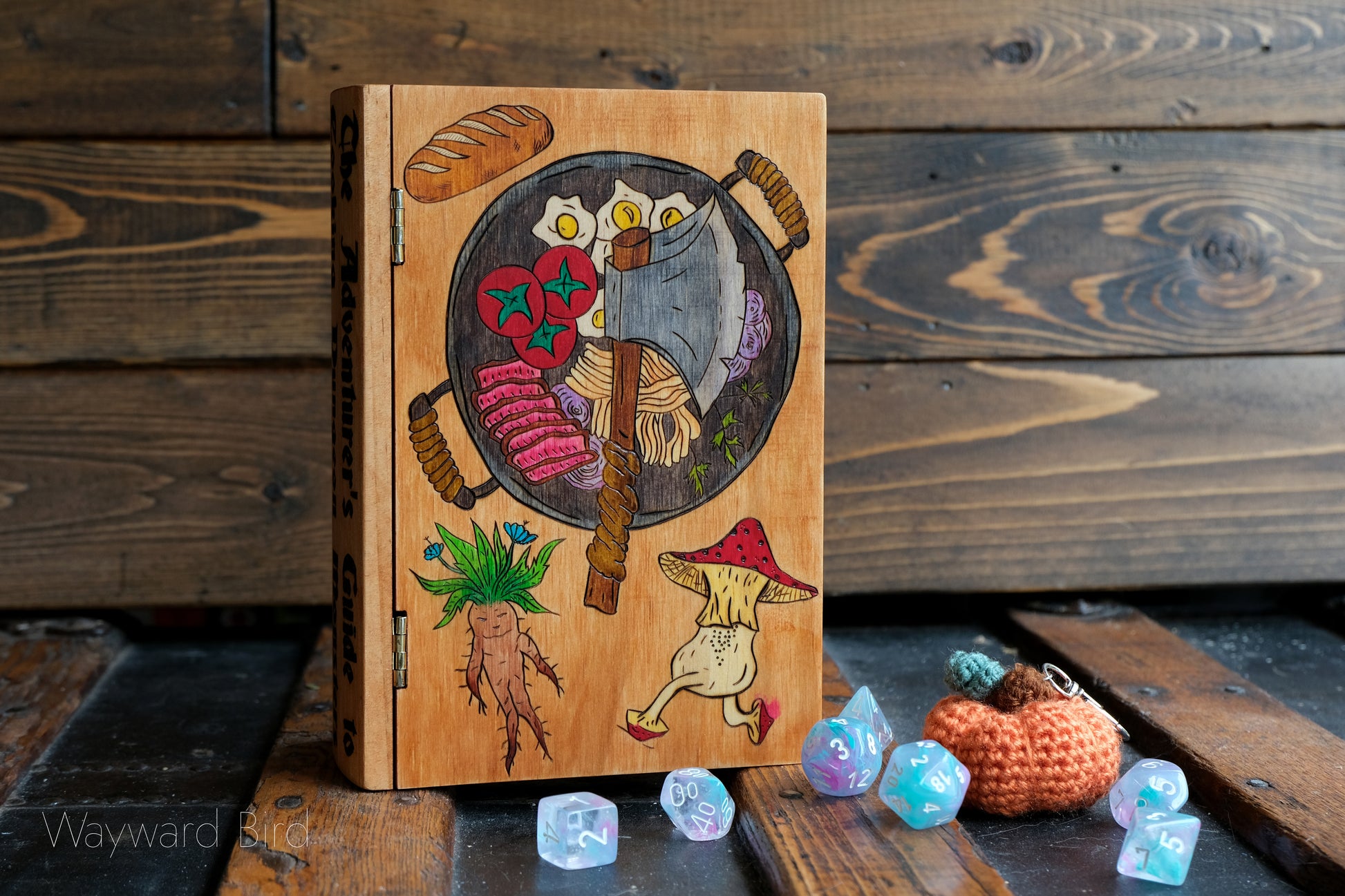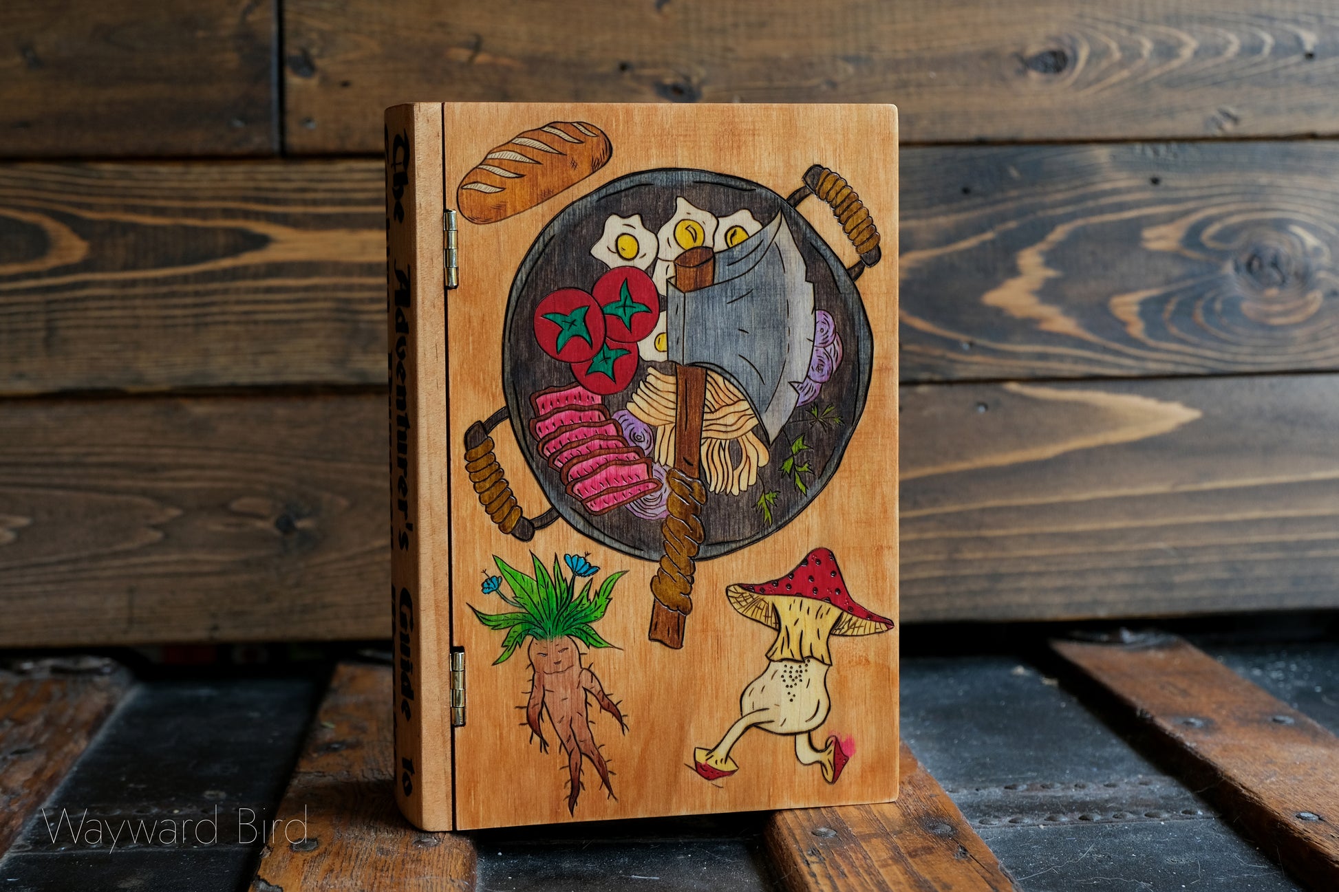The Adventurer's Guide to Cooking Dungeon Monsters is an artwork hand-burned and coloured on a wooden book box by pyrography artist, Natasha Allen.