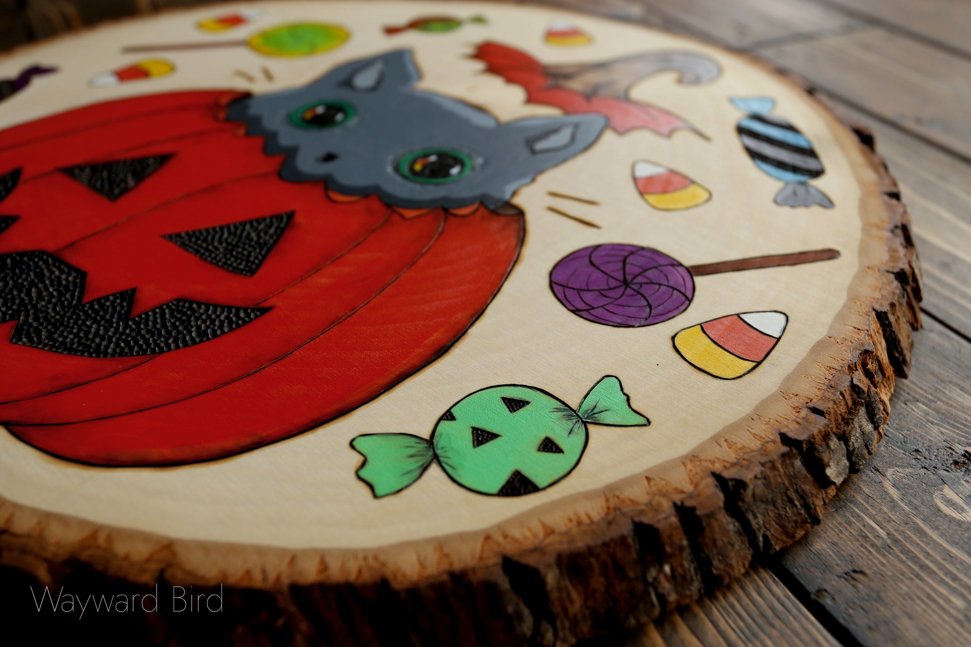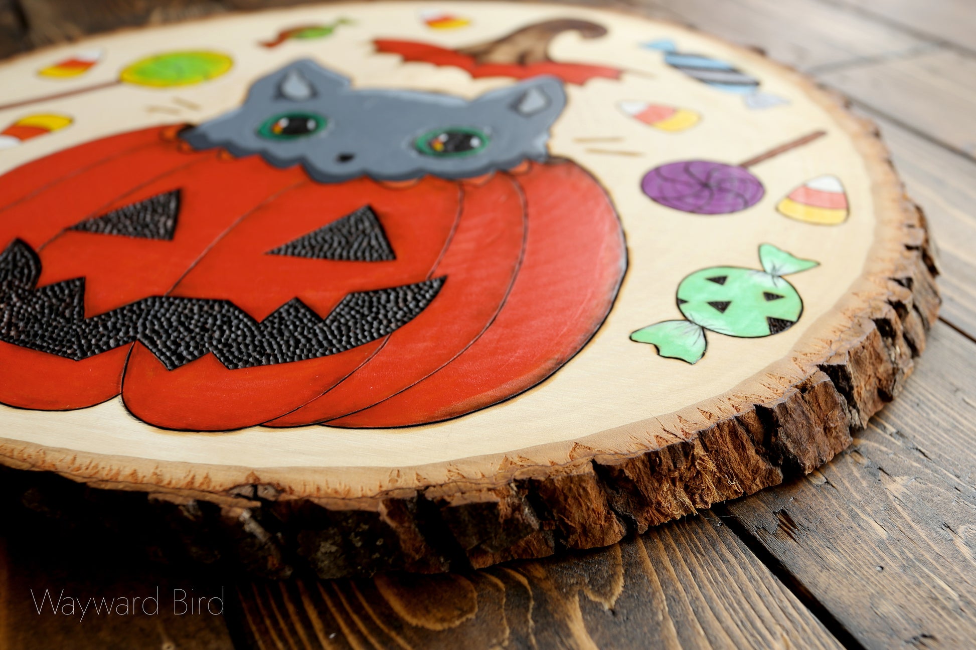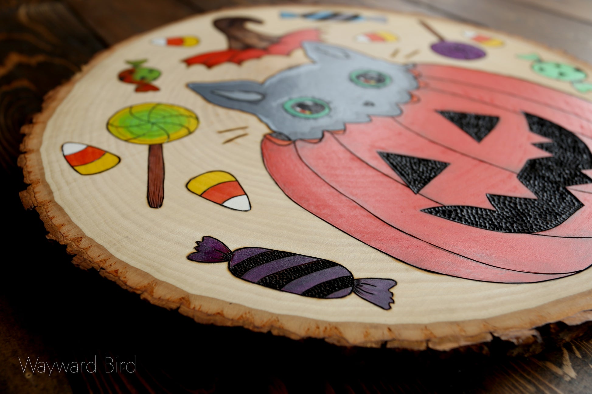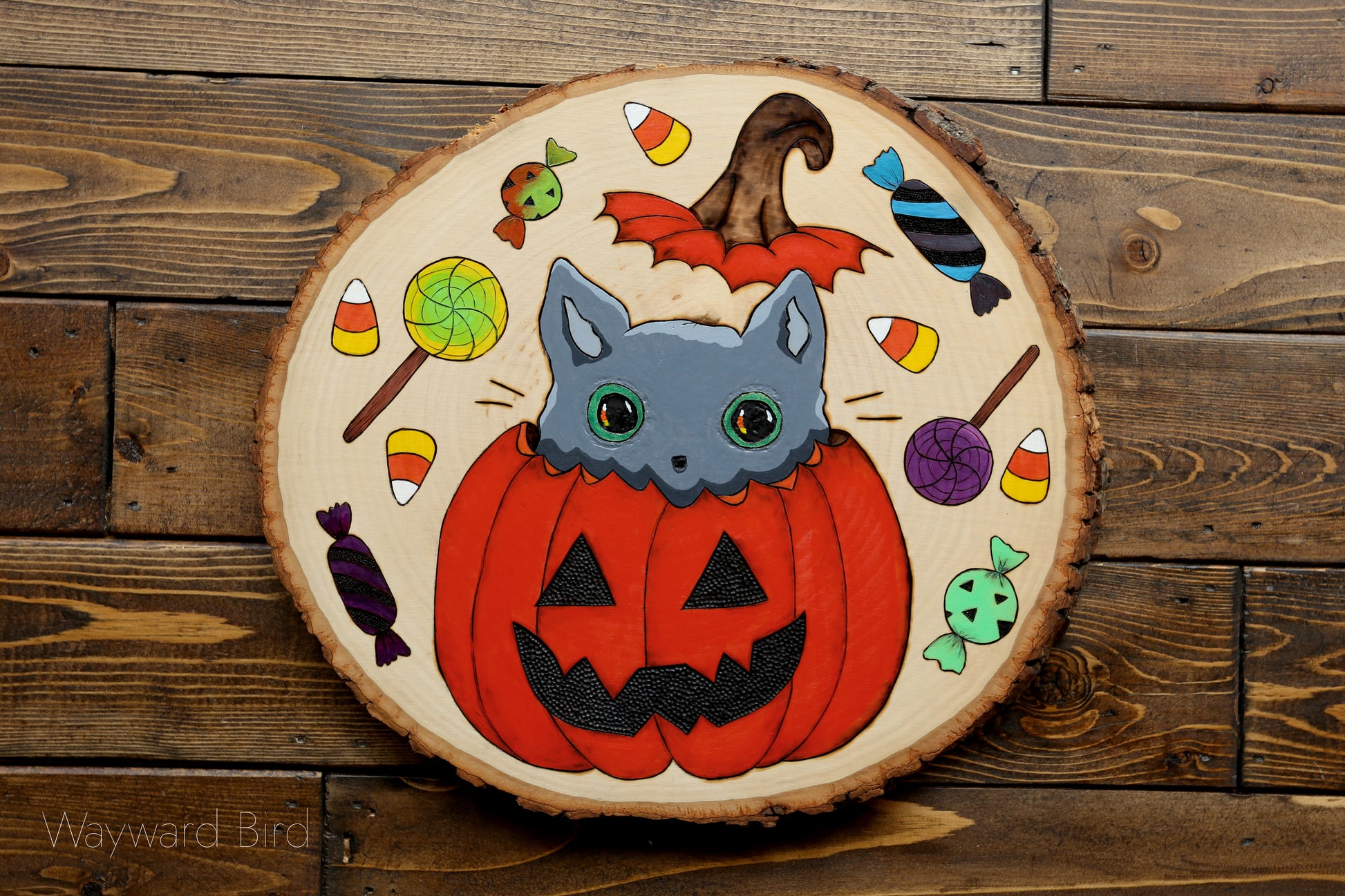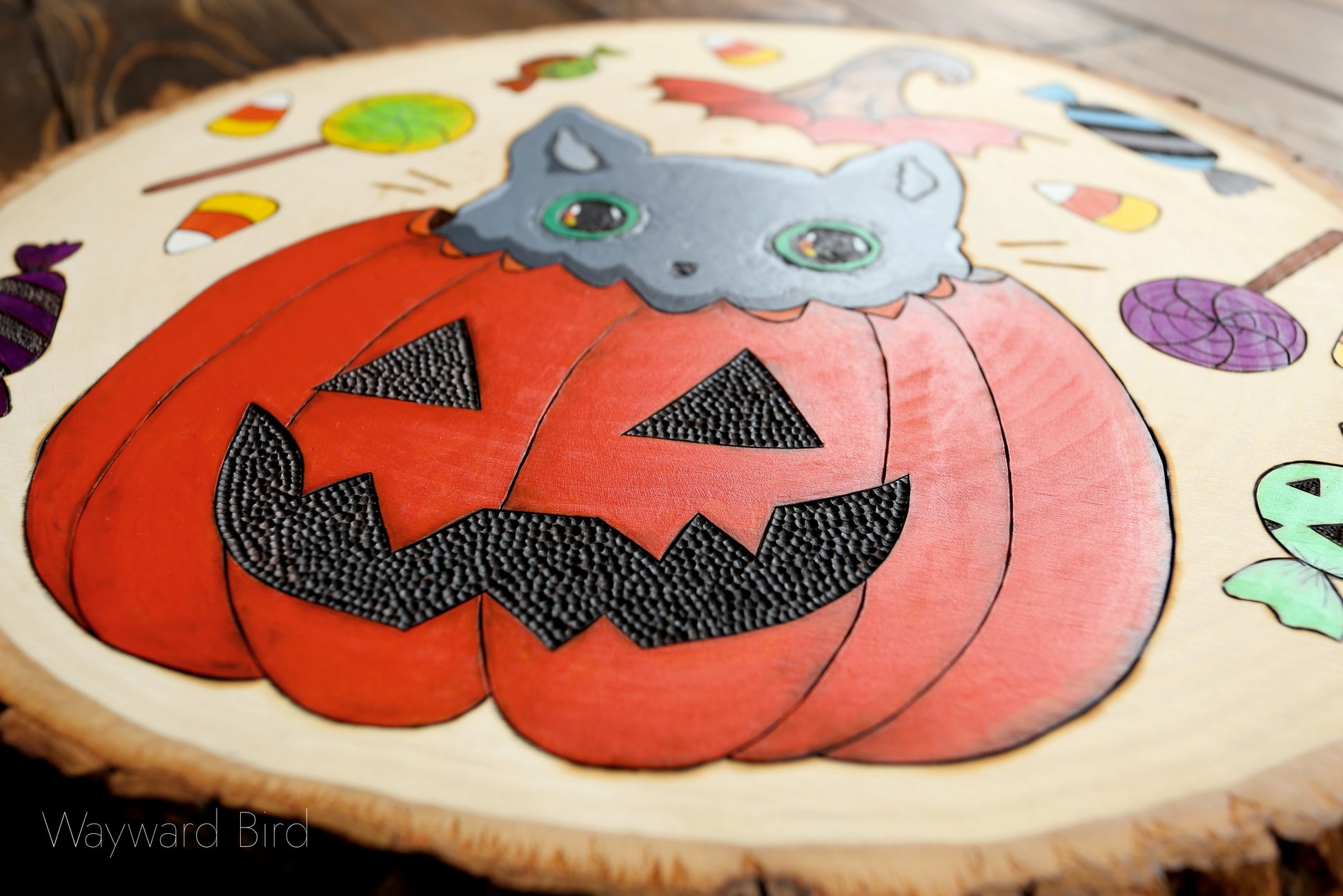 Trick Or Treat Kitten is an original artwork hand-burned and painted on basswood by pyrography artist, Natasha Allen. The kitty has iridescent golden-green eyes.