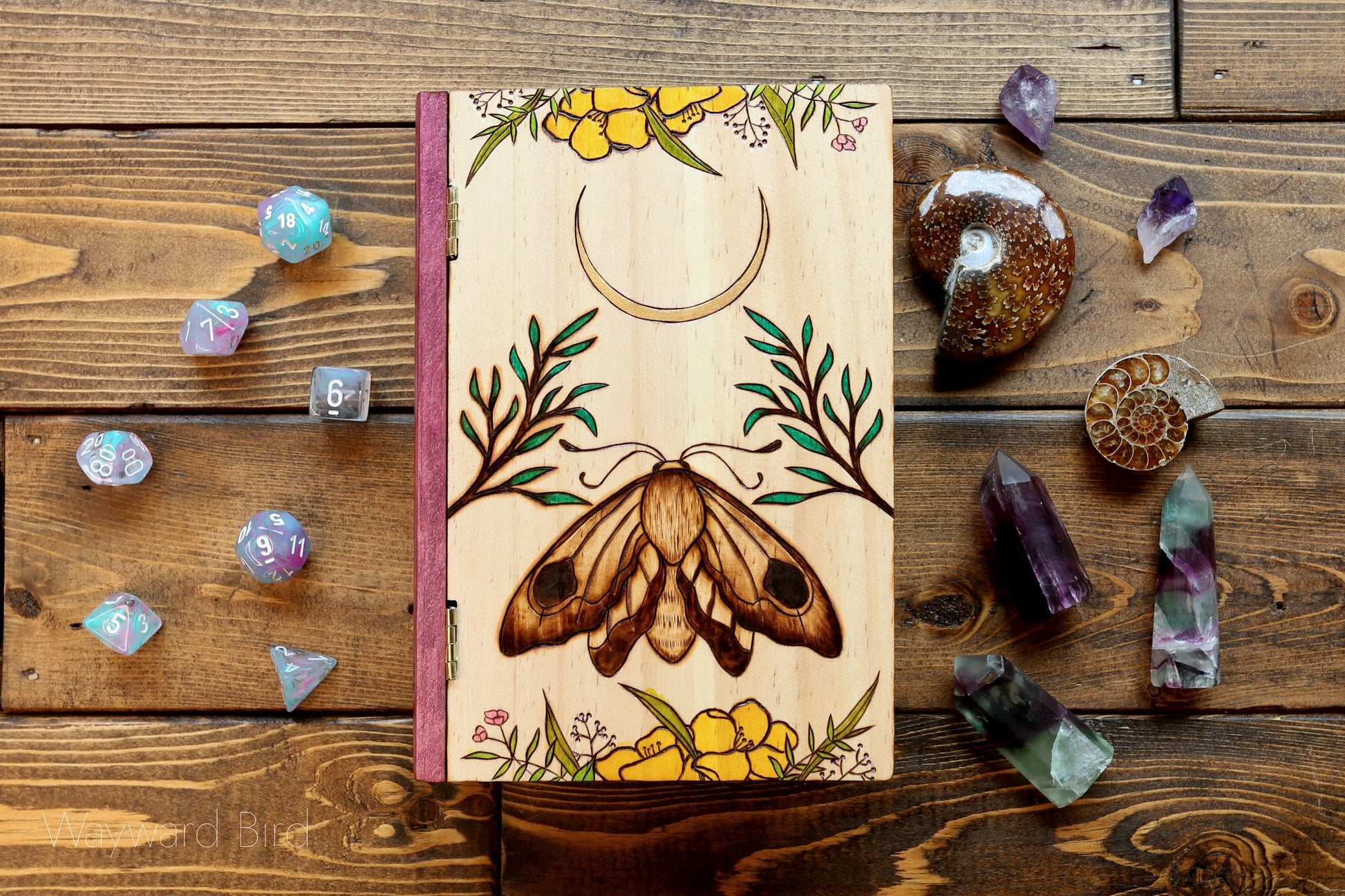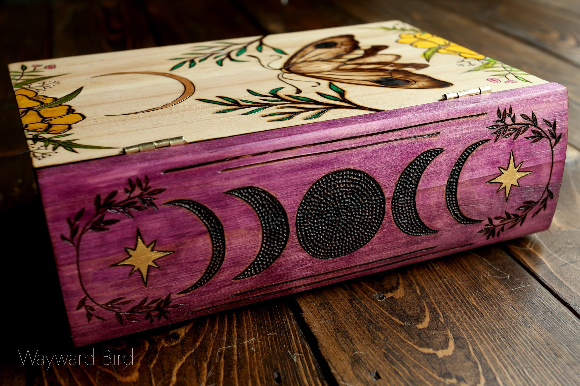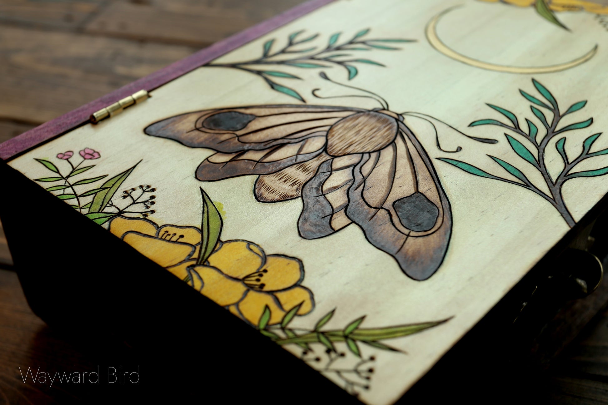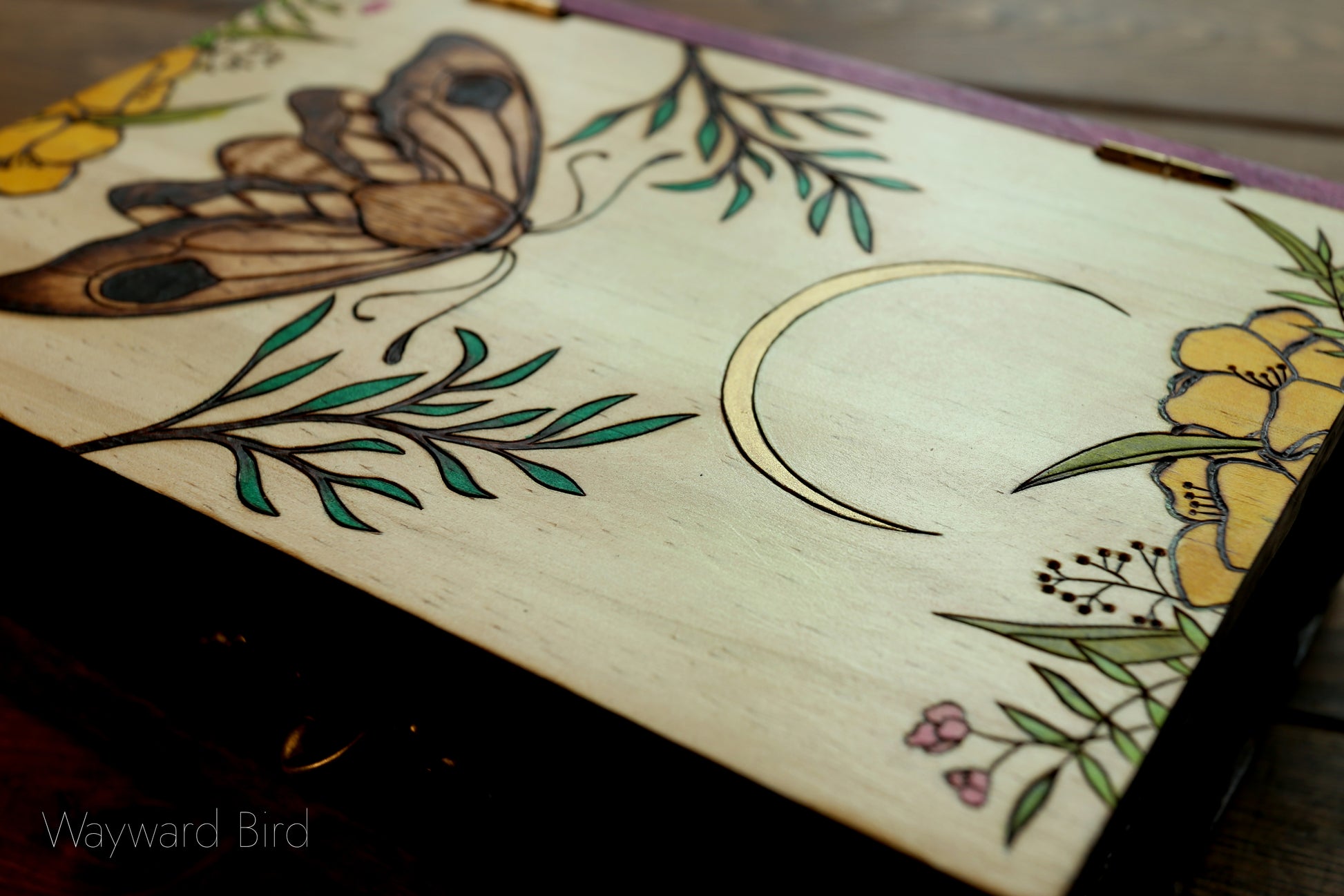 Witches Spellbook is an artwork hand-burned and coloured on a wooden book box by pyrography artist, Natasha Allen.