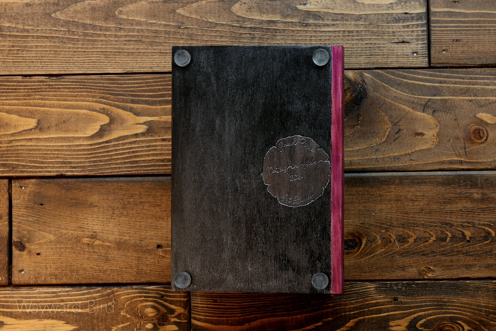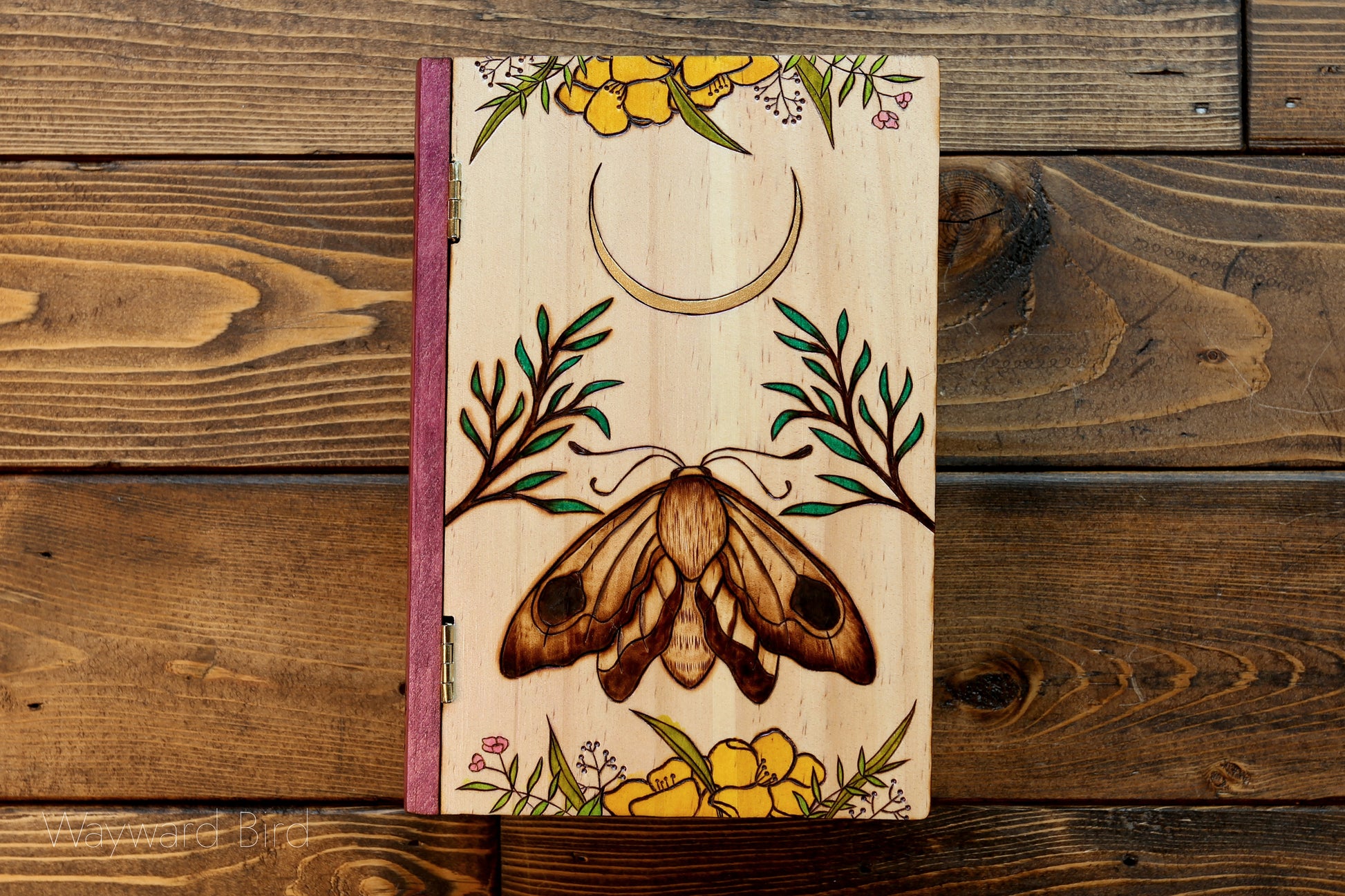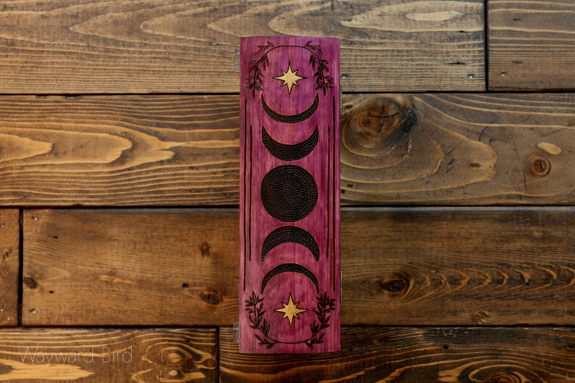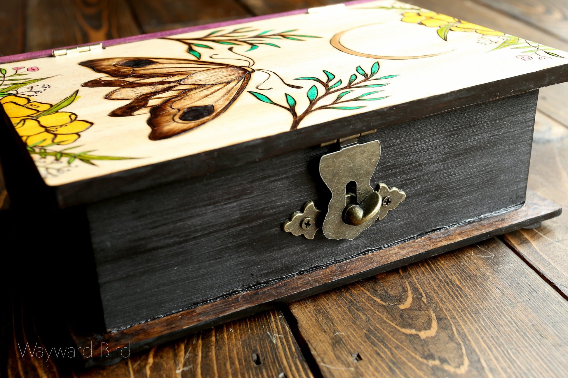 Witches Spellbook is an artwork hand-burned and coloured on a wooden book box by pyrography artist, Natasha Allen.